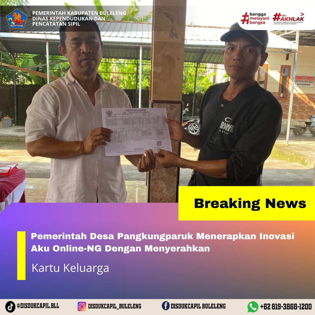 Pemerintah Kabupaten Buleleng melalui Dinas Kependudukan dan Pecatatan Sipil (Disdukcapil) Kabupaten Buleleng memaksimalkan serta mempermudah pelayanan kependudukan masyarakat dengan beberapa inovasi, melalui aplikasi AKU Online-NG. Dimana dalam penerapan aplikasi Aku Online-NG tersebut masyarakat tidak perlu lagi datang ke Dinas Dukcapil untuk melakukan pelayanan langsung cukup dengan datang ke Desa nanti akan dibantu oleh operator Desa masing-masing. Di Desa Pangkungparuk Kecamatan Seririt, telah diserahkan dokumen kependudukan berupa Kartu Keluarga atas nama I Gusti Ketut Sastrawan warga Banjar Dinas Kembang Sari Desa Pangkungparuk yang diserahkan oleh Pemerintah Desa Pangkungparuk, Rabu (17/12).