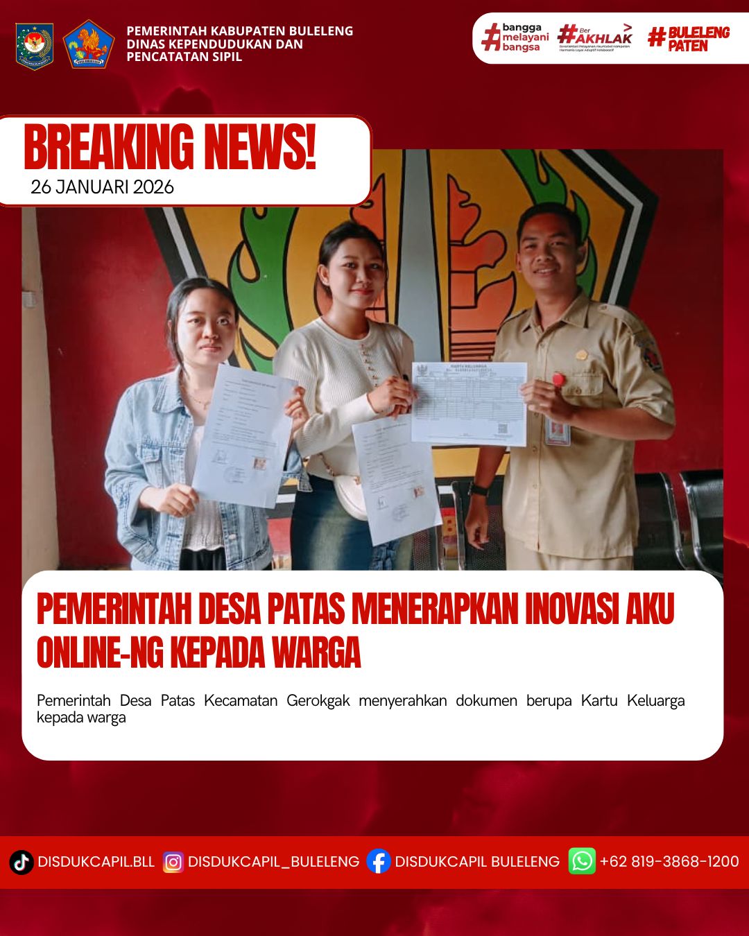 Pemerintah Kabupaten Buleleng melalui Dinas Kependudukan dan Pecatatan Sipil (Disdukcapil) Kabupaten Buleleng memaksimalkan serta mempermudah pelayanan kependudukan masyarakat dengan beberapa inovasi, melalui aplikasi AKU Online-NG. Dimana dalam penerapan aplikasi Aku Online-NG tersebut masyarakat tidak perlu lagi datang ke Dinas Dukcapil untuk melakukan pelayanan langsung cukup dengan datang ke Desa nanti akan dibantu oleh operator Desa masing-masing. Di Desa Patas Kecamatan Gerokgak, telah diserahkan dokumen kependudukan berupa Kartu Keluarga atas nama Sayuti warga Banjar Dinas Mekarsari yang diserahkan oleh staf tenaga administrasi Desa Patas kepada warga Banjar Dinas Mekarsari Desa Patas Kecamatan Gerokgak, Senin (26/1).