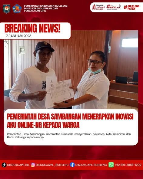 Pemerintah Kabupaten Buleleng melalui Dinas Kependudukan dan Pecatatan Sipil (Disdukcapil) Kabupaten Buleleng memaksimalkan serta mempermudah pelayanan kependudukan masyarakat dengan beberapa inovasi, melalui aplikasi AKU Online-NG. Dimana dalam penerapan aplikasi Aku Online-NG tersebut masyarakat tidak perlu lagi datang ke Dinas Dukcapil untuk melakukan pelayanan langsung cukup dengan datang ke Desa nanti akan dibantu oleh operator Desa masing-masing. Di Desa Sambangan Kecamatan Sukasada, telah diserahkan dokumen kependudukan berupa Akta Kelahiran atas nama Ketut Panji Pradana dan Kartu Keluarga atas nama Gede Darmadi warga Banjar Dinas Babakan yang diserahkan oleh Kasi Pemerintahan Desa Sambangan bertempat di Kantor Perbekel Desa Sambangan, Kecamatan Sukasada, Kabupaten Buleleng, Rabu (7/1).