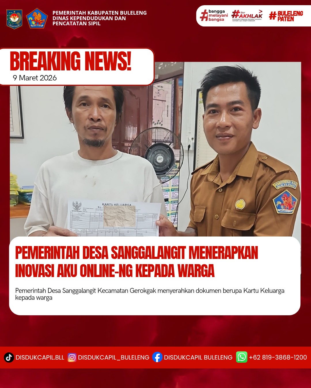Pemerintah Kabupaten Buleleng melalui Dinas Kependudukan dan Pecatatan Sipil (Disdukcapil) Kabupaten Buleleng memaksimalkan serta mempermudah pelayanan kependudukan masyarakat dengan beberapa inovasi, melalui aplikasi AKU Online-NG. Dimana dalam penerapan aplikasi Aku Online-NG tersebut masyarakat tidak perlu lagi datang ke Dinas Dukcapil untuk melakukan pelayanan langsung cukup dengan datang ke Desa nanti akan dibantu oleh operator Desa masing-masing. Di Desa Sanggalangit Kecamatan Gerokgak, telah diserahkan dokumen kependudukan berupa Kartu Keluarga kepada warga atas nama Ketut Suirta Banjar Dinas Tamansari Desa Sanggalangit warga Banjar Dinas Tamansari Desa Sanggalangit Kecamatan Gerokgak oleh Kasi Pemerintahan, Desa Sanggalangit, Senin (9/3).