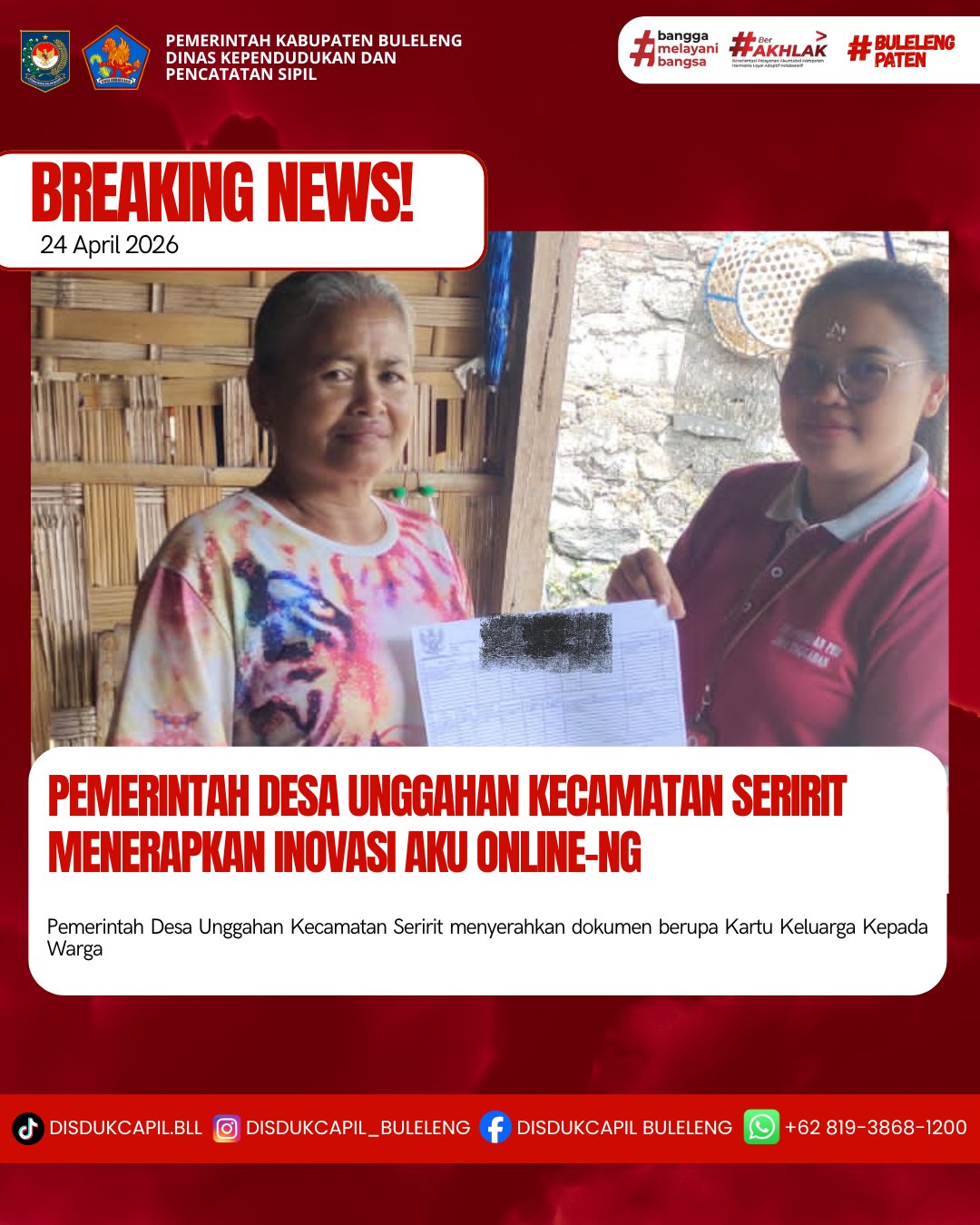 Pemerintah Kabupaten Buleleng melalui Dinas Kependudukan dan Pecatatan Sipil (Disdukcapil) Kabupaten Buleleng memaksimalkan serta mempermudah pelayanan kependudukan masyarakat dengan beberapa inovasi, melalui aplikasi AKU Online-NG. Dimana dalam penerapan aplikasi Aku Online-NG tersebut masyarakat tidak perlu lagi datang ke Dinas Dukcapil untuk melakukan pelayanan langsung, cukup dengan datang ke Desa nanti akan dibantu oleh operator Desa masing-masing. Di Desa Unggahan Kecamatan Seririt, telah diserahkan dokumen kependudukan berupa Kartu Keluarga atas nama I KETUT ARKEN yang diserahkan oleh Operator Desa Unggahan kepada warga yang bertempat di Kantor Perbekel Desa Unggahan, Kecamatan Seririt, Kabupaten Buleleng, Jumat (24/4).