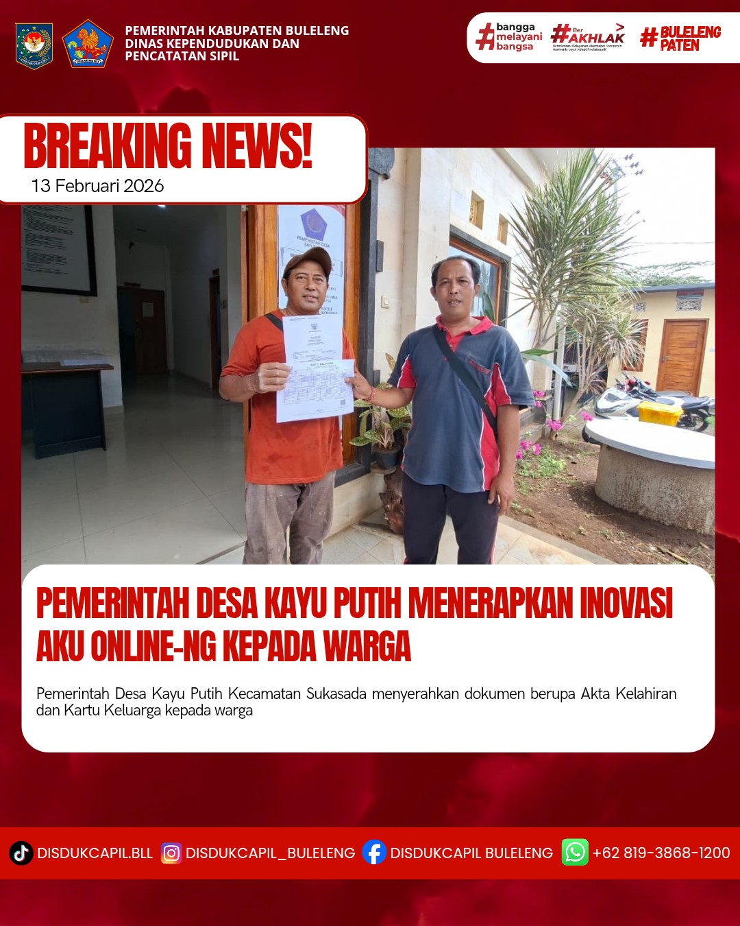 Pemerintah Kabupaten Buleleng melalui Dinas Kependudukan dan Pecatatan Sipil (Disdukcapil) Kabupaten Buleleng memaksimalkan serta mempermudah pelayanan kependudukan masyarakat dengan beberapa inovasi, melalui aplikasi AKU Online-NG. Dimana dalam penerapan aplikasi Aku Online-NG tersebut masyarakat tidak perlu lagi datang ke Dinas Dukcapil untuk melakukan pelayanan langsung cukup dengan datang ke Desa nanti akan dibantu oleh operator Desa masing-masing. Di Desa Kayu Putih Kecamatan Sukasada, telah diserahkan dokumen kependudukan berupa Akta Kelahiran atas nama Komang Ayu Murniasih dan Kartu Keluarga atas nama Gede Sukrada warga Banjar Dinas Bhuanasari, Desa Kayu Putih, Kecamatan Sukasada yang diserahkan secara langsung oleh Kelian Banjar Dinas Panti Desa Kayu Putih Kecamatan Sukasada, Jumat (13/2).