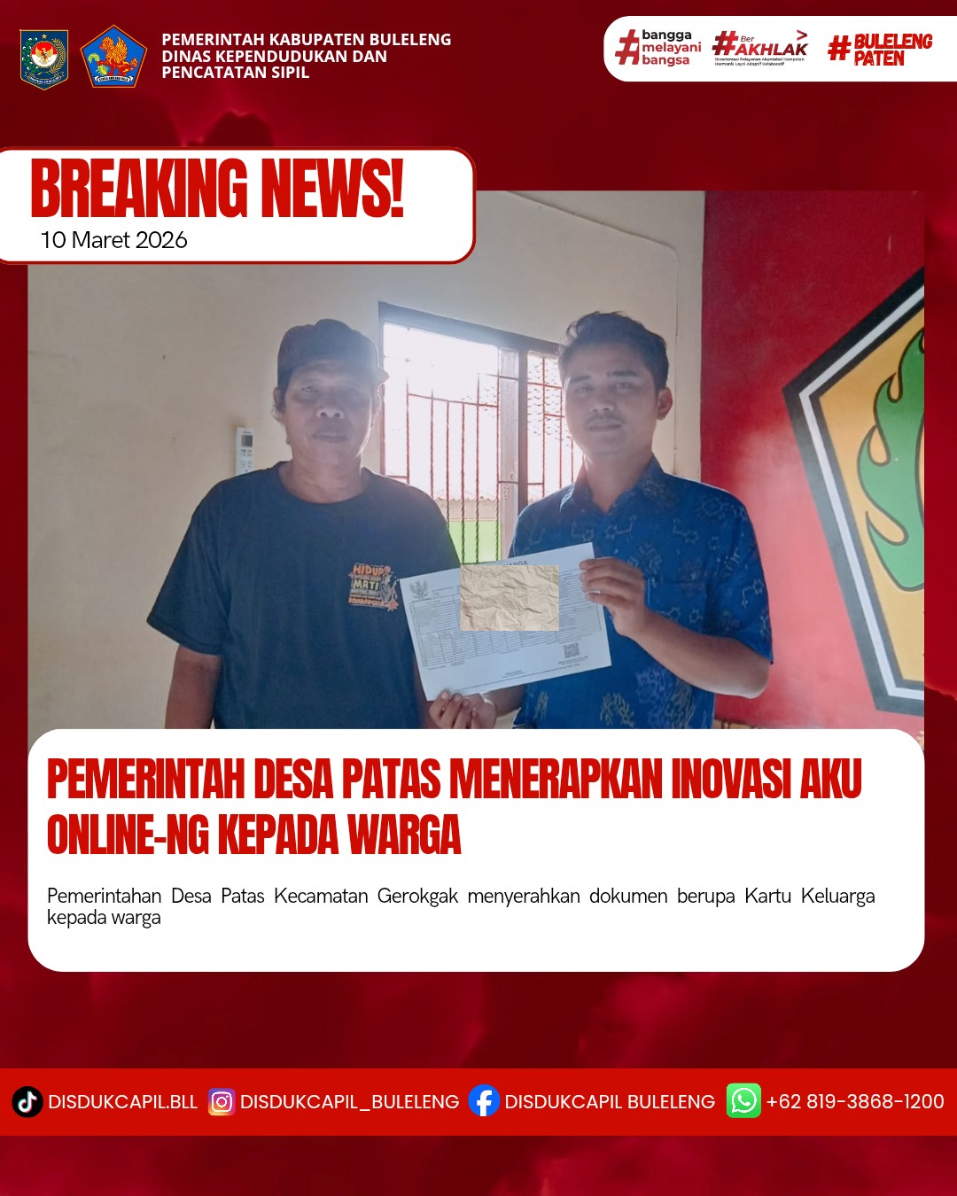 Pemerintah Kabupaten Buleleng melalui Dinas Kependudukan dan Pecatatan Sipil (Disdukcapil) Kabupaten Buleleng memaksimalkan serta mempermudah pelayanan kependudukan masyarakat dengan beberapa inovasi, melalui aplikasi AKU Online-NG. Dimana dalam penerapan aplikasi Aku Online-NG tersebut masyarakat tidak perlu lagi datang ke Dinas Dukcapil untuk melakukan pelayanan langsung cukup dengan datang ke Desa nanti akan dibantu oleh operator Desa masing-masing. Di Desa Patas Kecamatan Gerokgak, telah diserahkan dokumen kependudukan berupa Kartu Keluarga atas nama Kadek Suparta warga Banjar Dinas Tegal Asri, Desa Patas yang diserahkan langsung oleh Kaur Tata Usaha dan Umum Desa Patas Kecamatan Gerokgak, Selasa (10/3).