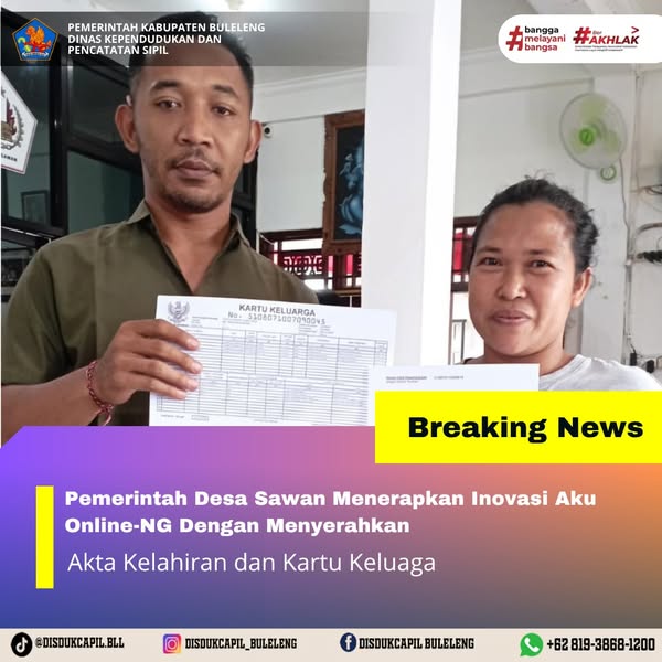Pemerintah Kabupaten Buleleng melalui Dinas Kependudukan dan Pecatatan Sipil (Disdukcapil) Kabupaten Buleleng memaksimalkan serta mempermudah pelayanan kependudukan masyarakat dengan beberapa inovasi, melalui aplikasi AKU Online-NG. Dimana dalam penerapan aplikasi Aku Online-NG tersebut masyarakat tidak perlu lagi datang ke Dinas Dukcapil untuk melakukan pelayanan langsung cukup dengan datang ke Desa nanti akan dibantu oleh operator Desa masing-masing. Di Desa Sawan Kecamatan Sawan, telah diserahkan dokumen kependudukan berupa Akta Kelahiran dan Kartu Keluarga atas nama Gusti Komang Sura Nasi yang diserahkan secara langsung oleh Staf Operator Desa Sawan, Kamis (16/10).