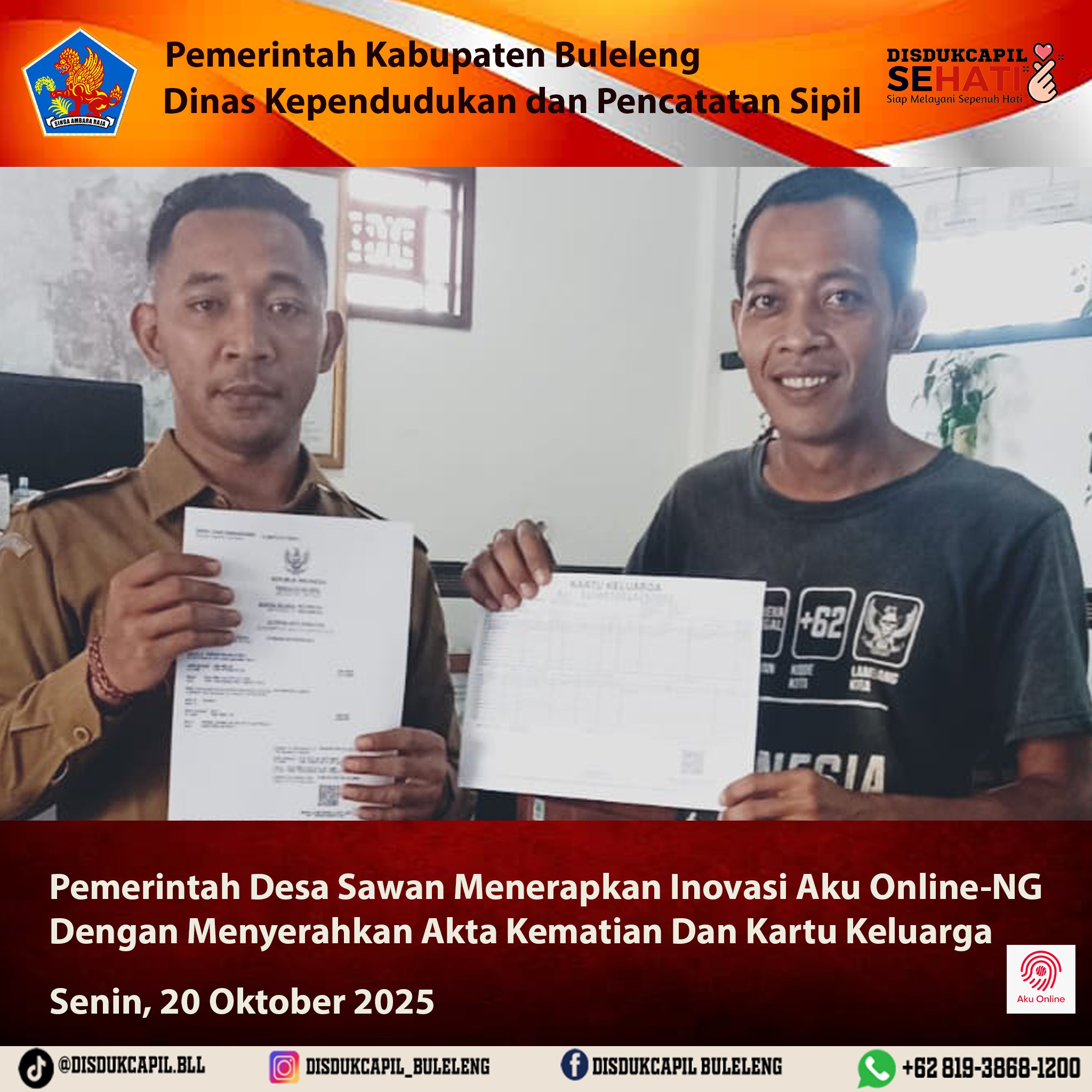 Pemerintah Kabupaten Buleleng melalui Dinas Kependudukan dan Pecatatan Sipil (Disdukcapil) Kabupaten Buleleng memaksimalkan serta mempermudah pelayanan kependudukan masyarakat dengan beberapa inovasi, melalui aplikasi AKU Online-NG. Dimana dalam penerapan aplikasi Aku Online-NG tersebut masyarakat tidak perlu lagi datang ke Dinas Dukcapil untuk melakukan pelayanan langsung cukup dengan datang ke Desa nanti akan dibantu oleh operator Desa masing-masing. Di Desa Sawan Kecamatan Sawan, telah diserahkan dokumen kependudukan berupa Akta Kematian dan Kartu Keluarga yang diserahkan secara langsung oleh Staf Operator Desa Sawan, Senin (20/10).