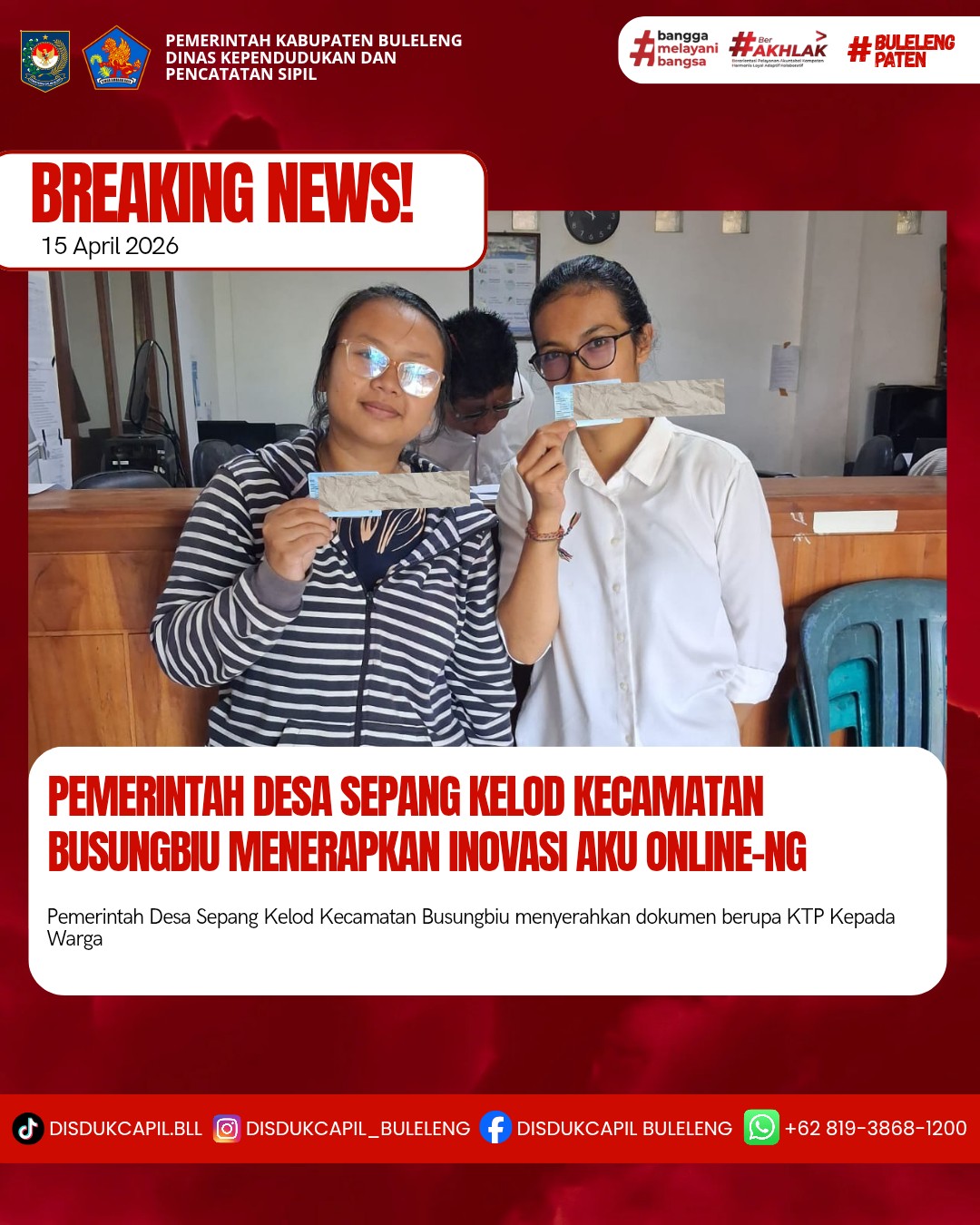 Pemerintah Kabupaten Buleleng melalui Dinas Kependudukan dan Pecatatan Sipil (Disdukcapil) Kabupaten Buleleng memaksimalkan serta mempermudah pelayanan kependudukan masyarakat dengan beberapa inovasi, melalui aplikasi AKU Online. Dimana dalam penerapan aplikasi Aku Online tersebut masyarakat tidak perlu lagi datang ke Dinas Dukcapil untuk melakukan pelayanan langsung, cukup dengan datang ke Desa nanti akan dibantu oleh operator Desa masing-masing. Di Desa Sepang Kelod Kecamatan Busungbiu telah diserahkan dokumen kependudukan berupa KTP warga Banjar Dinas Bujak, Desa Sepang Kelod Kecamatan Busungbiu yang diserahkan oleh Plt Kasi Pemerintahan bertempat di Kantor Perbekel Desa Sepang Kelod, Kecamatan Busungbiu, Rabu (15/4).