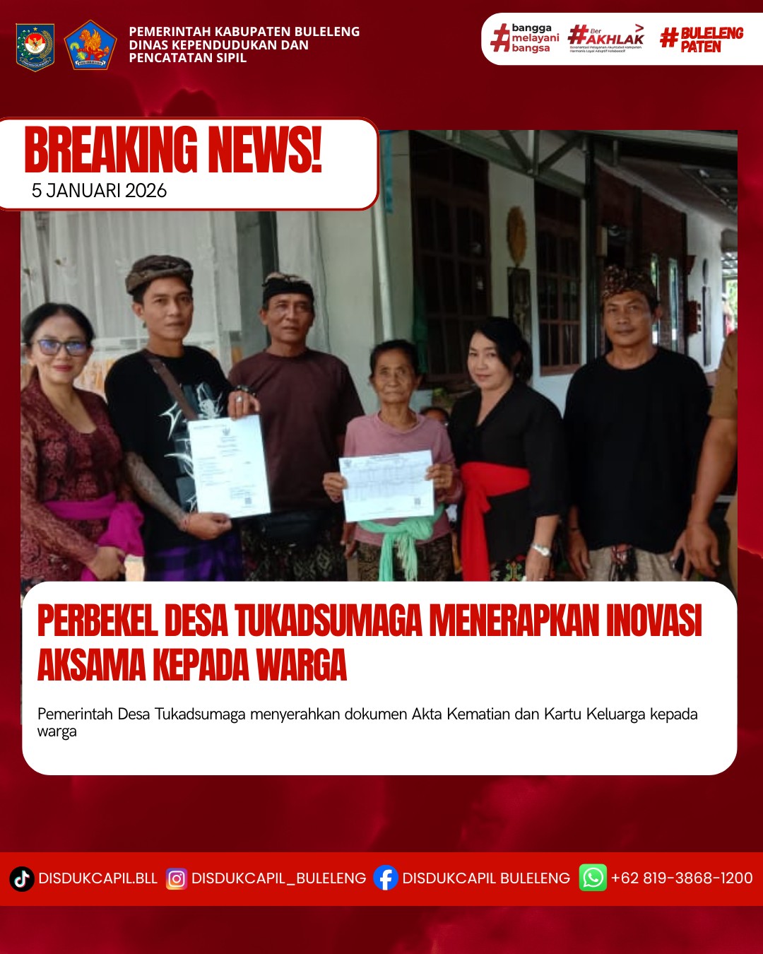 Pemerintah Kabupaten Buleleng melalui Dinas Kependudukan dan Pecatatan Sipil (Disdukcapil) Kabupaten Buleleng memaksimalkan serta mempermudah pelayanan kependudukan masyarakat dengan beberapa inovasi, yakni BALITA (Bayi Lahir Berakta), NYAKSI (Menyerahkan Akta Kawin Saat Acara Perkawinan) dan AKSAMA ( Akta Kematian Diserahkan Saat Masih Berduka) melalui aplikasi Aku Online. Di Desa Tukadsumaga Kecamatan Gerokgak, telah diterapkan program Aksama (Akta Kematian Diserahkan Saat Masih Berduka) yang dilakukan secara langsung oleh Perbekel Tukadsumaga ANAK AGUNG SRI WATHI dengan menyerahkan Akta Kematian atas nama I WAYAN SESA dan Kartu Keluarga atas nama NI NYOMAN LATRI kepada pihak keluarga almarhum di Desa Tukadusumaga Kecamatan Gerokgak, Senin (5/1).