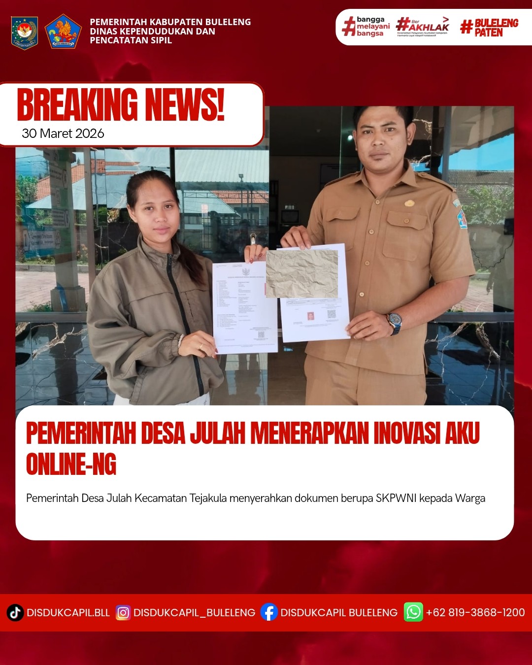 Pemerintah Kabupaten Buleleng melalui Dinas Kependudukan dan Pecatatan Sipil (Disdukcapil) Kabupaten Buleleng memaksimalkan serta mempermudah pelayanan kependudukan masyarakat dengan beberapa inovasi, melalui aplikasi AKU Online-NG. Dimana dalam penerapan aplikasi Aku Online-NG tersebut masyarakat tidak perlu lagi datang ke Dinas Dukcapil untuk melakukan pelayanan langsung, cukup dengan datang ke Desa nanti akan dibantu oleh operator Desa masing-masing. Di Desa Julah Kecamatan Tejakula, telah diserahkan dokumen kependudukan berupa SKPWNI atas nama NI WAYAN AYU CINDY yang beralamat di Banjar Dinas Kawanan , Desa Julah yang diserahkan langsung oleh Kelian Banjar Dinas Kawanan , Desa Julah bertempat di Kantor Perbekel Desa Julah, Kecamatan Tejakula, Kabupaten Buleleng, Senin (30/3).