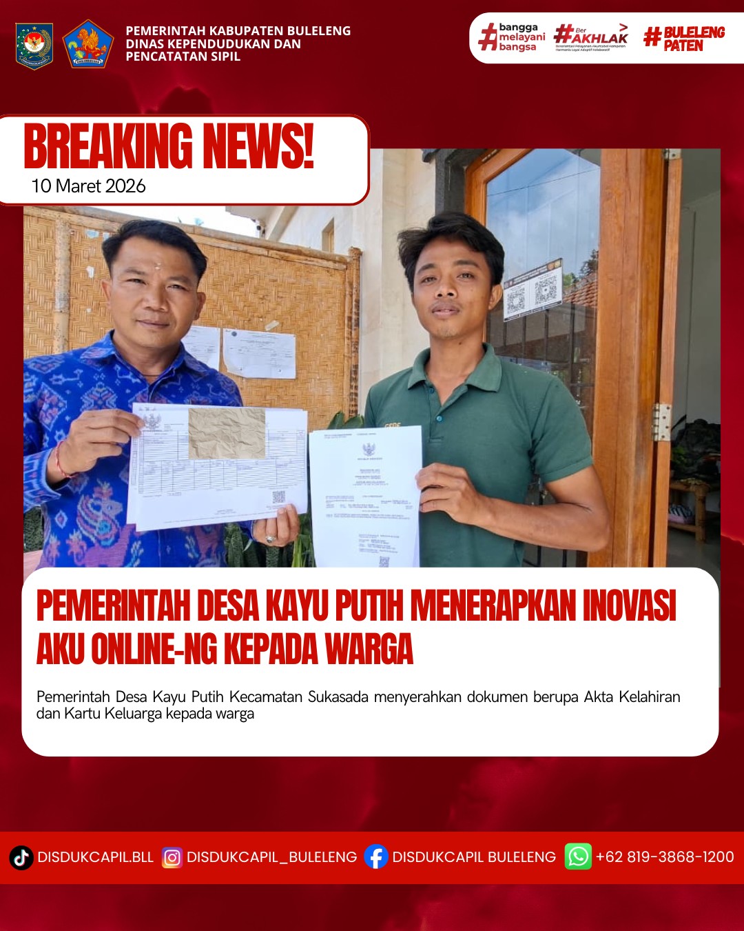 Pemerintah Kabupaten Buleleng melalui Dinas Kependudukan dan Pecatatan Sipil (Disdukcapil) Kabupaten Buleleng memaksimalkan serta mempermudah pelayanan kependudukan masyarakat dengan beberapa inovasi, melalui aplikasi AKU Online-NG. Dimana dalam penerapan aplikasi Aku Online-NG tersebut masyarakat tidak perlu lagi datang ke Dinas Dukcapil untuk melakukan pelayanan langsung cukup dengan datang ke Desa nanti akan dibantu oleh operator Desa masing-masing. Di Desa Kayu Putih Kecamatan Sukasada, telah diserahkan dokumen kependudukan berupa Akta Kelahiran atas nama Putu Jia Purustia dan Kartu Keluarga atas nama Komang Trisna warga Banjar Dinas Kayuputih, Desa Kayu Putih, Kecamatan Sukasada yang diserahkan secara langsung oleh Kasi Pemerintahan Desa Kayu Putih Kecamatan Sukasada, Selasa (10/3).