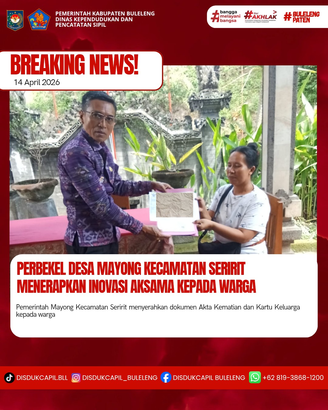 Pemerintah Kabupaten Buleleng melalui Dinas Kependudukan dan Pecatatan Sipil (Disdukcapil) Kabupaten Buleleng memaksimalkan serta mempermudah pelayanan kependudukan masyarakat dengan beberapa inovasi, yakni BALITA (Bayi Lahir Berakta), NYAKSI (Menyerahkan Akta Kawin Saat Acara Perkawinan) dan AKSAMA (Akta Kematian Diserahkan Saat Masih Berduka) melalui aplikasi Aku Online-NG. Di Desa Mayong Kecamatan Seririt, telah diterapkan program Aksama (Akta Kematian Diserahkan Saat Masih Berduka) yang dilakukan secara langsung oleh Perbekel Desa Mayong Made Astawan,S.Sn. menyerahkan Akta Kematian atas nama Made Mahardika Yasa dan Kartu Keluarga kepada pihak keluarga di rumah duka di Desa Mayong, Selasa (14/4).