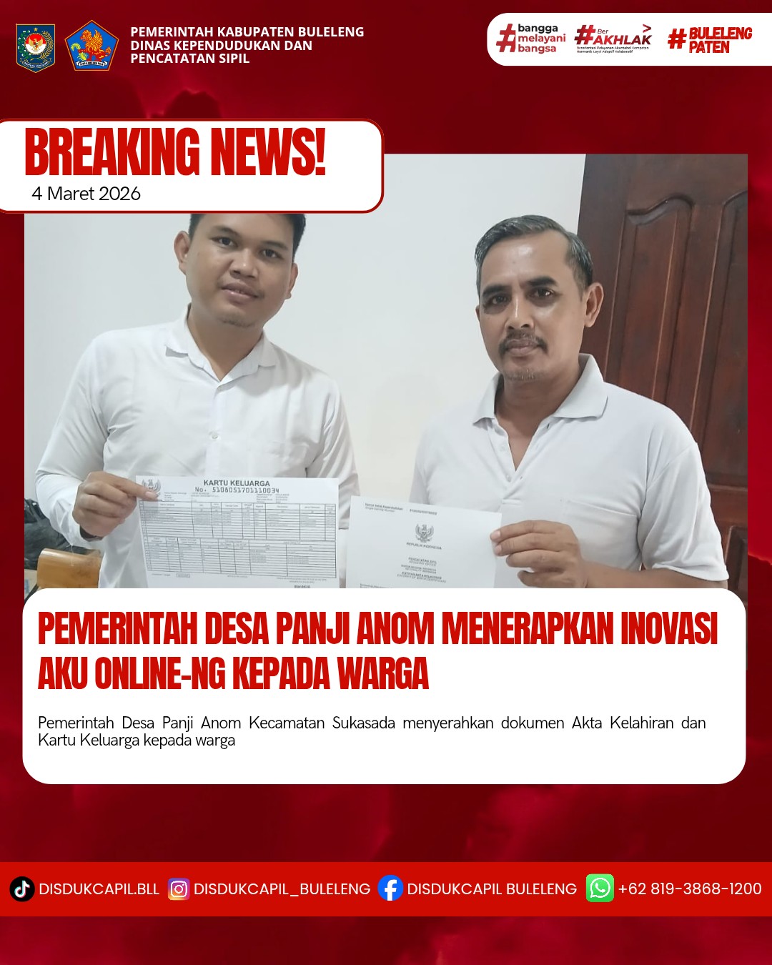 Pemerintah Kabupaten Buleleng melalui Dinas Kependudukan dan Pecatatan Sipil (Disdukcapil) Kabupaten Buleleng memaksimalkan serta mempermudah pelayanan kependudukan masyarakat dengan beberapa inovasi, melalui aplikasi AKU Online-NG. Dimana dalam penerapan aplikasi Aku Online-NG tersebut masyarakat tidak perlu lagi datang ke Dinas Dukcapil untuk melakukan pelayanan langsung cukup dengan datang ke Desa nanti akan dibantu oleh operator Desa masing-masing. Di Desa Panji Anom Kecamatan Sukasada, telah diserahkan dokumen kependudukan berupa Akta Kelahiran dan Kartu Keluarga atas nama I GEDE BENDESA yang diserahkan langsung oleh Kasi Pemerintahan Desa Panji Anom bertempat di Kantor Perbekel Panji Anom, Kecamatan Sukasada, Rabu (4/3).