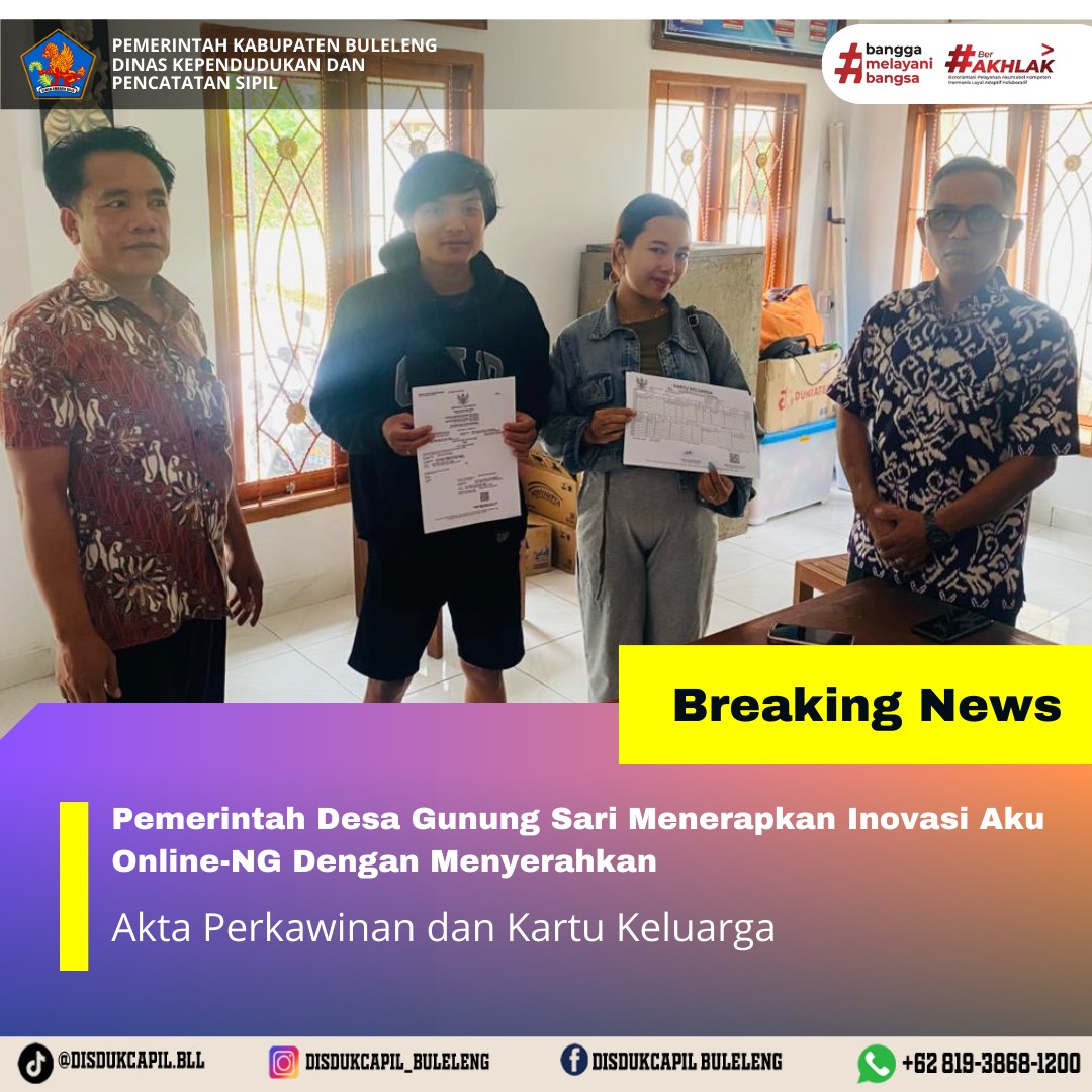 Pemerintah Kabupaten Buleleng melalui Dinas Kependudukan dan Pecatatan Sipil (Disdukcapil) Kabupaten Buleleng memaksimalkan serta mempermudah pelayanan kependudukan masyarakat dengan beberapa inovasi, melalui aplikasi AKU Online-NG. Dimana dalam penerapan aplikasi Aku Online-NG tersebut masyarakat tidak perlu lagi datang ke Dinas Dukcapil untuk melakukan pelayanan langsung cukup dengan datang ke Desa nanti akan dibantu oleh operator Desa masing-masing. Di Desa Gunungsari Kecamatan Seririt, telah diserahkan dokumen kependudukan berupa Akta Perkawinan dan Kartu Keluarga atas nama GEDE NOVIAN ARI PRATAMA yang diserahkan oleh Pemerintah Desa Gunungsari kepada warga Banjar Dinas Sekar, bertempat di Kantor Perbekel Desa Gunungsari, Kecamatan Seririt, Kabupaten Buleleng, Selasa (2/12).