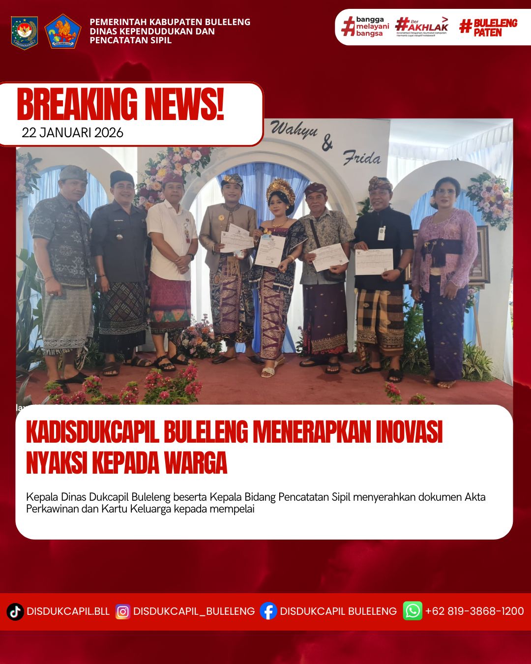 Pemerintah Kabupaten Buleleng melalui Dinas Kependudukan dan Pecatatan Sipil (Disdukcapil) Kabupaten Buleleng memaksimalkan serta mempermudah pelayanan kependudukan masyarakat dengan beberapa inovasi, yakni BALITA (Bayi Lahir Berakta), NYAKSI (Menyerahkan Akta Kawin Saat Acara Perkawinan) dan AKSAMA ( Akta Kematian Diserahkan Saat Masih Berduka) melalui aplikasi Aku Online-NG. Di Desa Tejakula Kecamatan Tejakula, telah diterapkan program NYAKSI (Menyerahkan Akta Kawin Saat Acara Perkawinan) yang dilakukan secara langsung oleh Kadisdukcapil Buleleng Made Juartawan, S.STP, MM didampingi oleh Kepala Bidang Pelayanan dan Pencatatan Sipil Disdukcapil Buleleng I Ketut Sudiana, SE dengan menyerahkan Akta Perkawinan dan Kartu Keluarga kepada kedua mempelai dan Kartu Keluarga mempelai dan masing-masing orang tua mempelai, Kamis (22/1).