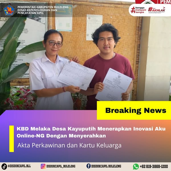 Pemerintah Kabupaten Buleleng melalui Dinas Kependudukan dan Pecatatan Sipil (Disdukcapil) Kabupaten Buleleng memaksimalkan serta mempermudah pelayanan kependudukan masyarakat dengan beberapa inovasi, melalui aplikasi AKU Online-NG. Dimana dalam penerapan aplikasi Aku Online-NG tersebut masyarakat tidak perlu lagi datang ke Dinas Dukcapil untuk melakukan pelayanan langsung cukup dengan datang ke Desa nanti akan dibantu oleh operator Desa masing-masing. Di Desa Kayuputih Kecamatan Sukasada, telah diserahkan dokumen kependudukan berupa Akta Perkawinan atas nama Komang Yuda Pratama Darma Putra dan Kadek Dewi Juliani dan Kartu Keluarga atas nama Gede Pujana, Putu Redita, dan Komang Yuda Pratama Darma Putra yang diserahkan langsung oleh KBD Melaka Desa Kayuputih Kecamatan Sukasada bertempat di kantor Perbekel Desa Kayuputih, Kecamatan Sukasada, Kabupaten Buleleng, Rabu (27/8).