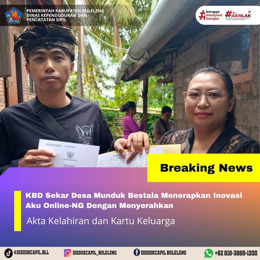 Pemerintah Kabupaten Buleleng melalui Dinas Kependudukan dan Pecatatan Sipil (Disdukcapil) Kabupaten Buleleng memaksimalkan serta mempermudah pelayanan kependudukan masyarakat dengan beberapa inovasi, melalui aplikasi AKU Online. Dimana dalam penerapan aplikasi Aku Online tersebut masyarakat tidak perlu lagi datang ke Dinas Dukcapil untuk melakukan pelayanan langsung cukup dengan datang ke Desa nanti akan dibantu oleh operator Desa masing-masing. Di Desa Munduk Bestala Kecamatan Seririt telah diserahkan dokumen kependudukan berupa Akta Kelahiran dan Kartu Keluarga oleh Kelian Banjar Dinas Sekar Desa Munduk Bestala Kecamatan Seririt, Kamis (13/11).