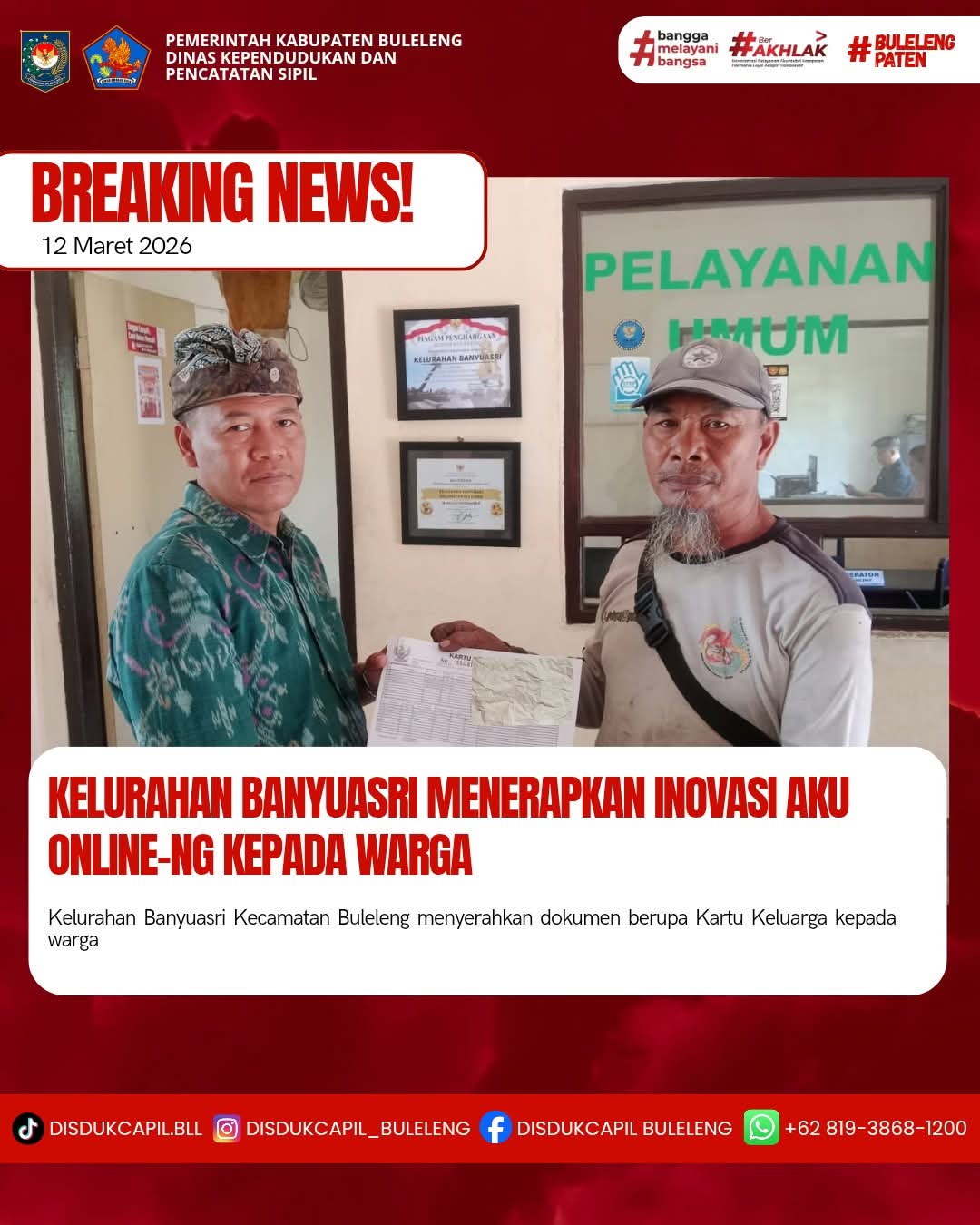 Pemerintah Kabupaten Buleleng melalui Dinas Kependudukan dan Pecatatan Sipil (Disdukcapil) Kabupaten Buleleng memaksimalkan serta mempermudah pelayanan kependudukan masyarakat dengan beberapa inovasi, melalui aplikasi AKU Online-NG. Dimana dalam penerapan aplikasi Aku Online-NG tersebut masyarakat tidak perlu lagi datang ke Dinas Dukcapil untuk melakukan pelayanan langsung cukup dengan datang ke Desa nanti akan dibantu oleh operator Desa masing-masing. Di Kelurahan Banyuasri Kecamatan Buleleng, telah diserahkan dokumen kependudukan berupa Kartu Keluarga atas nama Musaf Royani yang diserahkan langsung oleh Kaling Kelurahan Banyuasri, Kecamatan Buleleng, Kabupaten Buleleng, Kamis (12/3).