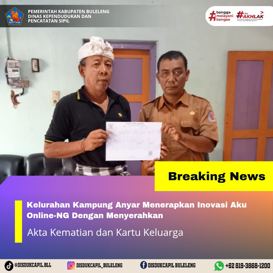 Pemerintah Kabupaten Buleleng melalui Dinas Kependudukan dan Pecatatan Sipil (Disdukcapil) Kabupaten Buleleng memaksimalkan serta mempermudah pelayanan kependudukan masyarakat dengan beberapa inovasi, melalui aplikasi AKU Online-NG. Dimana dalam penerapan aplikasi Aku Online-NG tersebut masyarakat tidak perlu lagi datang ke Dinas Dukcapil untuk melakukan pelayanan langsung cukup dengan datang ke Desa nanti akan dibantu oleh operator Desa masing-masing. Di Kelurahan Kampung Anyar Kecamatan Buleleng, telah diserahkan dokumen kependudukan berupa Akta Kematian dan Kartu Keluarga atas nama Nyoman Karang yang diserahkan langsung oleh Kelurahan Kampung Anyar Kecamatan Buleleng, Kabupaten Buleleng, Senin (22/12).