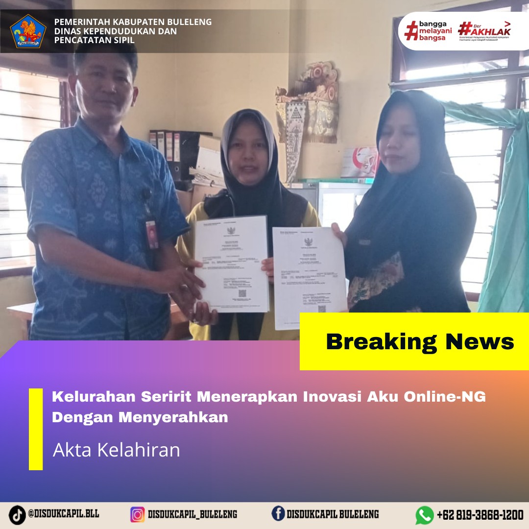 Pemerintah Kabupaten Buleleng melalui Dinas Kependudukan dan Pecatatan Sipil (Disdukcapil) Kabupaten Buleleng memaksimalkan serta mempermudah pelayanan kependudukan masyarakat dengan beberapa inovasi, melalui aplikasi AKU Online-NG. Dimana dalam penerapan aplikasi Aku Online-NG tersebut masyarakat tidak perlu lagi datang ke Dinas Dukcapil untuk melakukan pelayanan langsung cukup dengan datang ke Desa nanti akan dibantu oleh operator Desa masing-masing. Di Kelurahan Seririt Kecamatan Seririt, telah diserahkan dokumen kependudukan berupa Akta Kelahiran atas nama Yuli Ratnawati dan Intan Soleha yang diserahkan langsung oleh Operator Kelurahan Seririt Kecamatan Seririt, Kabupaten Buleleng, Selasa (16/12).