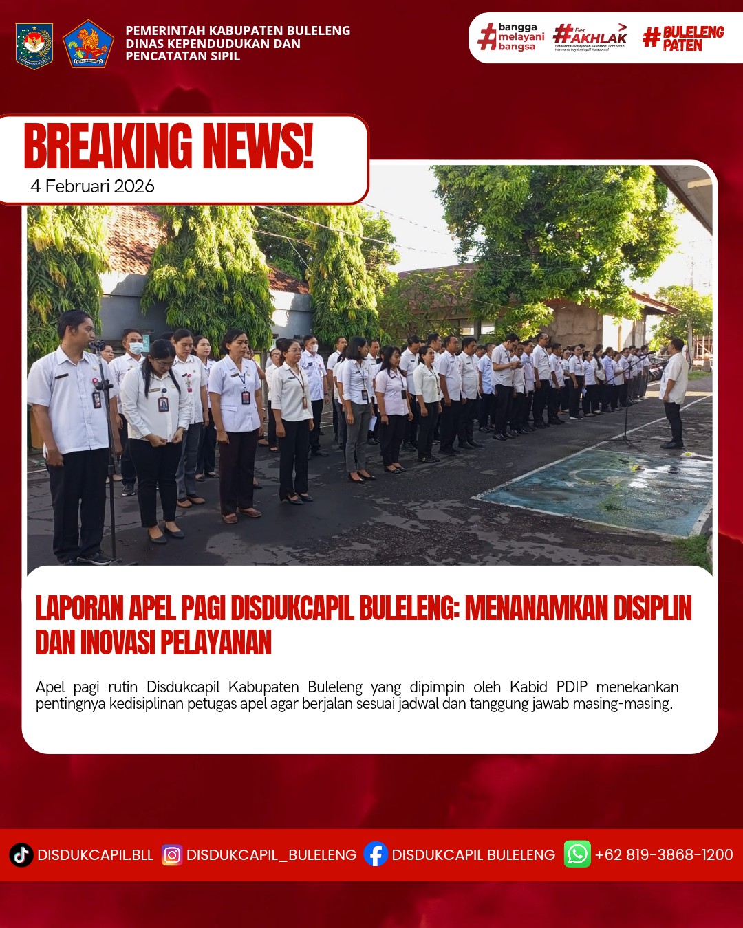 Apel pagi di lingkungan Disdukcapil Kabupaten Buleleng kembali digelar dengan dipimpin oleh Kepala Bidang PDIP. Dalam arahan tersebut, ditekankan pentingnya kedisiplinan petugas apel agar berjalan sesuai jadwal dan tanggung jawab masing-masing. Terkait kreativitas kerja, persiapan Lomba Video saat ini sedang masuk tahap finalisasi topik bersama Bapak Kadis, dengan skema pendanaan melalui sponsorship mengingat keterbatasan anggaran. Fokus utama pekan ini juga tertuju pada Inovasi SAKTI (Sinkronisasi Biodata Kependudukan Terintegrasi). Disdukcapil tengah aktif menjalin kolaborasi dengan empat instansi (Disdikpora, BKPSDM, TNI, dan POLRI) untuk mematangkan Perjanjian Kerjasama (PKS) mengenai pemutakhiran data status kepegawaian.