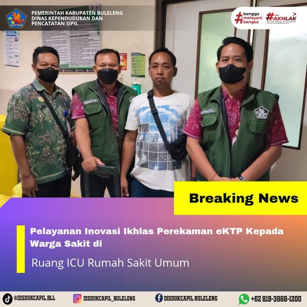 Pada hari ini Selasa, 7 Oktober 2025 Dinas Kependudukan dan Pencatatan Sipil Kabupaten Buleleng melaksanakan penerapan Inovasi Ikhlas dengan melakukan jemput bola kepada masyarakat untuk melakukan perekaman KTP-El kepada warga Sakit di Ruang ICU Rumah Sakit Umum sebanyak 1 orang atas nama :