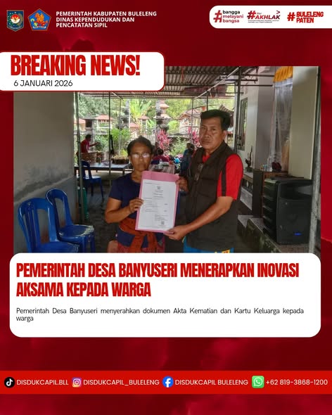 Pemerintah Kabupaten Buleleng melalui Dinas Kependudukan dan Pecatatan Sipil (Disdukcapil) Kabupaten Buleleng memaksimalkan serta mempermudah pelayanan kependudukan masyarakat dengan beberapa inovasi, yakni BALITA (Bayi Lahir Berakta), NYAKSI (Menyerahkan Akta Kawin Saat Acara Perkawinan) dan AKSAMA ( Akta Kematian Diserahkan Saat Masih Berduka) melalui aplikasi Aku Online. Di Desa Banyuseri Kecamatan Banjar, telah diterapkan program Aksama (Akta Kematian Diserahkan Saat Masih Berduka) yang dilakukan secara langsung oleh Kelian Banjar Dinas Desa, Desa Banyuseri dengan menyerahkan Akta Kematian atas nama I Wayan Suastika dan Kartu Keluarga kepada pihak keluarga almarhum di Desa Banyuseri Kecamatan Banjar, Selasa (6/1).