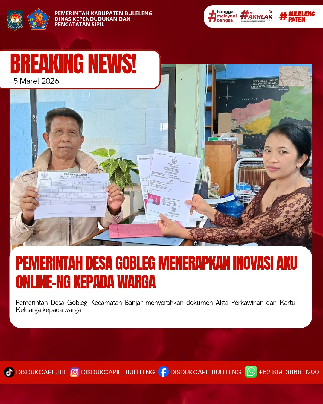 Pemerintah Kabupaten Buleleng melalui Dinas Kependudukan dan Pecatatan Sipil (Disdukcapil) Kabupaten Buleleng memaksimalkan serta mempermudah pelayanan kependudukan masyarakat dengan beberapa inovasi, melalui aplikasi AKU Online-NG. Dimana dalam penerapan aplikasi Aku Online-NG tersebut masyarakat tidak perlu lagi datang ke Dinas Dukcapil untuk melakukan pelayanan langsung cukup dengan datang ke Desa nanti akan dibantu oleh operator Desa masing-masing. Di Desa Gobleg Kecamatan Banjar, telah diserahkan dokumen kependudukan berupa Akta Perkawinan dan Kartu Keluarga atas nama I Made Arta yang diserahkan langsung oleh staf administrasi Desa Gobleg bertempat di Kantor Perbekel Desa Gobleg, Kecamatan Banjar, Kabupaten Buleleng, Kamis (5/3).