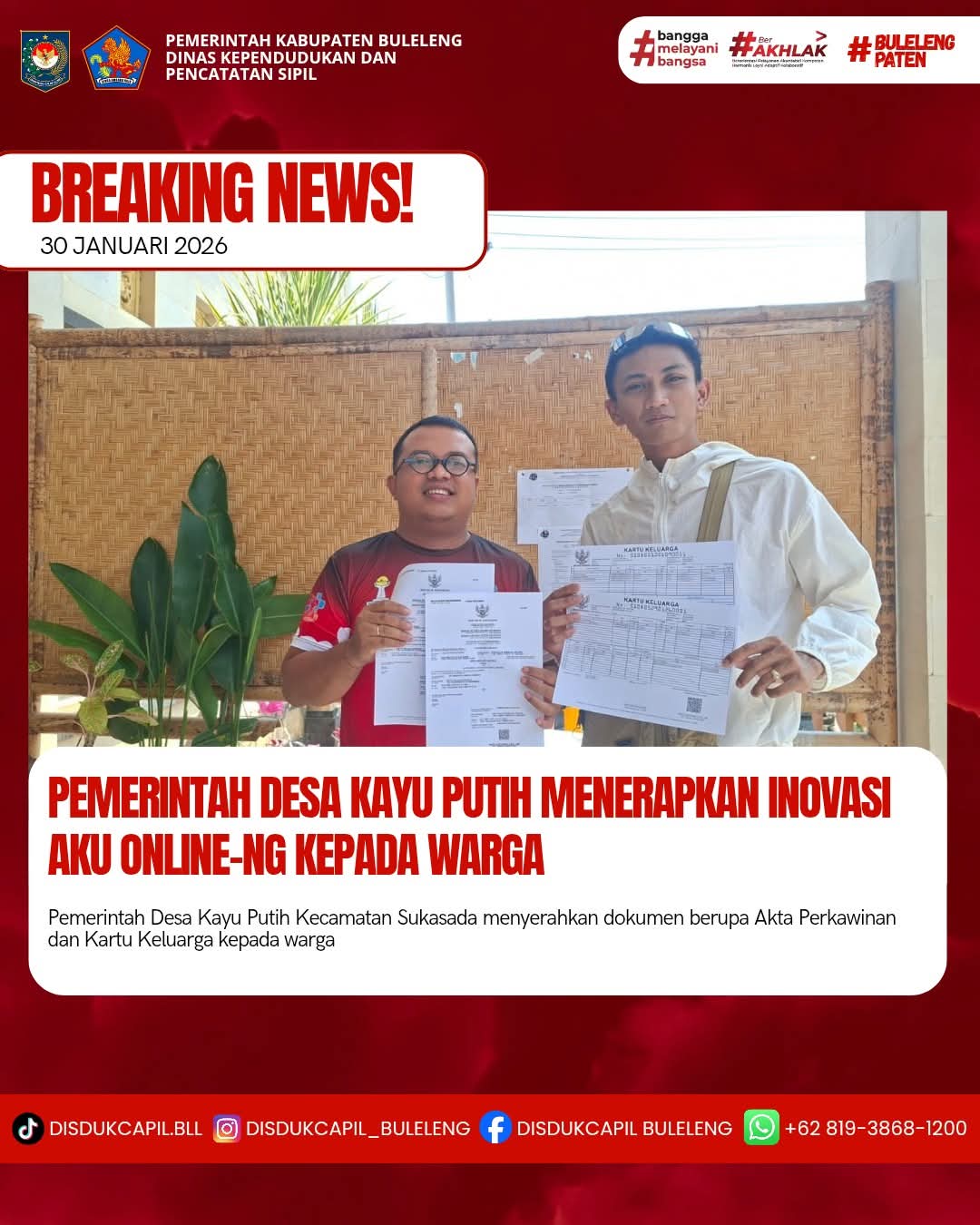 Pemerintah Kabupaten Buleleng melalui Dinas Kependudukan dan Pecatatan Sipil (Disdukcapil) Kabupaten Buleleng memaksimalkan serta mempermudah pelayanan kependudukan masyarakat dengan beberapa inovasi, melalui aplikasi AKU Online-NG. Dimana dalam penerapan aplikasi Aku Online-NG tersebut masyarakat tidak perlu lagi datang ke Dinas Dukcapil untuk melakukan pelayanan langsung cukup dengan datang ke Desa nanti akan dibantu oleh operator Desa masing-masing. Di Desa Kayu Putih Kecamatan Sukasada, telah diserahkan dokumen kependudukan berupa Akta Perkawinan atas nama Gede Nien Ari Cahyadi dengan Ni Nyoman Vinayaka Puspa Iswara dan Kartu Keluarga atas Ketut Wenten dan Gede Nien Ari Cahyadi warga Banjar Dinas Melaka, Desa Kayu Putih, Kecamatan Sukasada yang diserahkan secara langsung oleh Kasi Kesejahteraan Desa Kayu Putih Kecamatan Sukasada, Jumat (30/1).