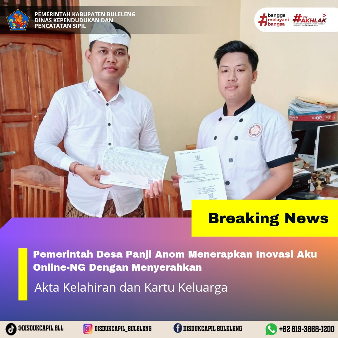 Pemerintah Kabupaten Buleleng melalui Dinas Kependudukan dan Pecatatan Sipil (Disdukcapil) Kabupaten Buleleng memaksimalkan serta mempermudah pelayanan kependudukan masyarakat dengan beberapa inovasi, melalui aplikasi AKU Online-NG. Dimana dalam penerapan aplikasi Aku Online-NG tersebut masyarakat tidak perlu lagi datang ke Dinas Dukcapil untuk melakukan pelayanan langsung cukup dengan datang ke Desa nanti akan dibantu oleh operator Desa masing-masing. Di Desa Panji Anom Kecamatan Sukasada, telah diserahkan dokumen kependudukan berupa Akta Kelahiran atas nama RANIA AZZAHRA KURNIA dan Kartu Keluarga atas nama RIJAL KURNIA JAYA yang diserahkan secara langsung oleh Kasi Pemerintahan Desa Panji Anom bertempat di Kantor Perbekel Panji Anom, Kecamatan Sukasada, Selasa (21/10).
