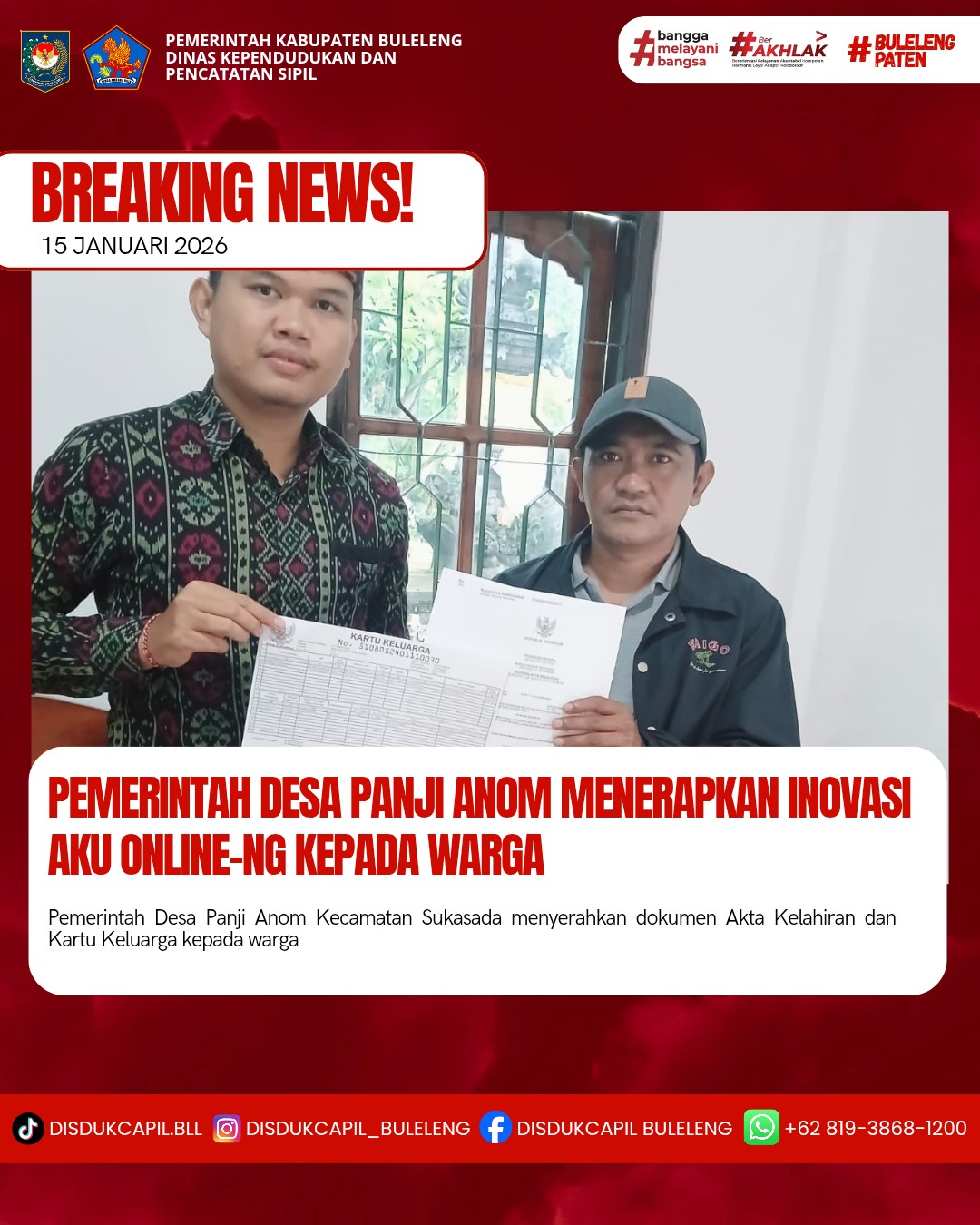 Pemerintah Kabupaten Buleleng melalui Dinas Kependudukan dan Pecatatan Sipil (Disdukcapil) Kabupaten Buleleng memaksimalkan serta mempermudah pelayanan kependudukan masyarakat dengan beberapa inovasi, melalui aplikasi AKU Online-NG. Dimana dalam penerapan aplikasi Aku Online-NG tersebut masyarakat tidak perlu lagi datang ke Dinas Dukcapil untuk melakukan pelayanan langsung cukup dengan datang ke Desa nanti akan dibantu oleh operator Desa masing-masing. Di Desa Panji Anom Kecamatan Sukasada, telah diserahkan dokumen kependudukan berupa Akta Kelahiran dan Kartu Keluarga atas nama NYOMAN SUDI yang diserahkan langsung oleh Kasi Pemerintahan Desa Panji Anom bertempat di Kantor Perbekel Panji Anom, Kecamatan Sukasada, Kamis (15/1).