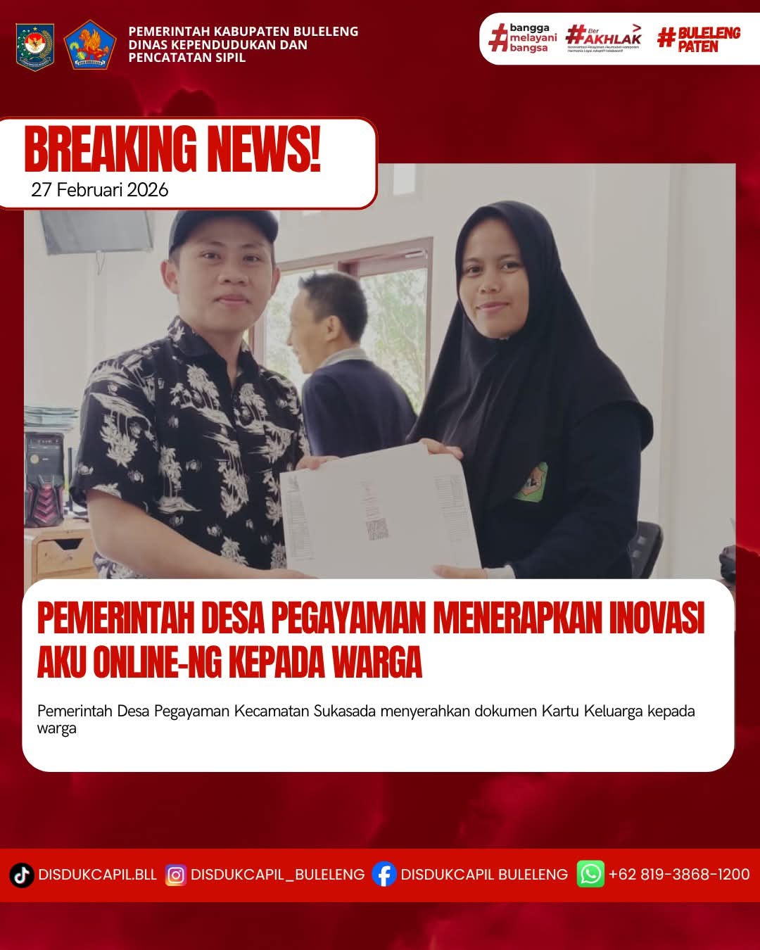 Pemerintah Kabupaten Buleleng melalui Dinas Kependudukan dan Pecatatan Sipil (Disdukcapil) Kabupaten Buleleng memaksimalkan serta mempermudah pelayanan kependudukan masyarakat dengan beberapa inovasi, melalui aplikasi AKU Online-NG. Dimana dalam penerapan aplikasi Aku Online-NG tersebut masyarakat tidak perlu lagi datang ke Dinas Dukcapil untuk melakukan pelayanan langsung cukup dengan datang ke Desa nanti akan dibantu oleh operator Desa masing-masing. Di Desa Pegayaman Kecamatan Sukasada, telah diserahkan dokumen kependudukan berupa Kartu Keluarga kepada warga atas nama Agus Riadi kepada warga yang beralamat di Banjar Dinas Kubu Lebah Desa Pegayaman yang diserahkan langsung oleh Kasi Pemerintahan Desa Pegayaman, Jumat (27/2).