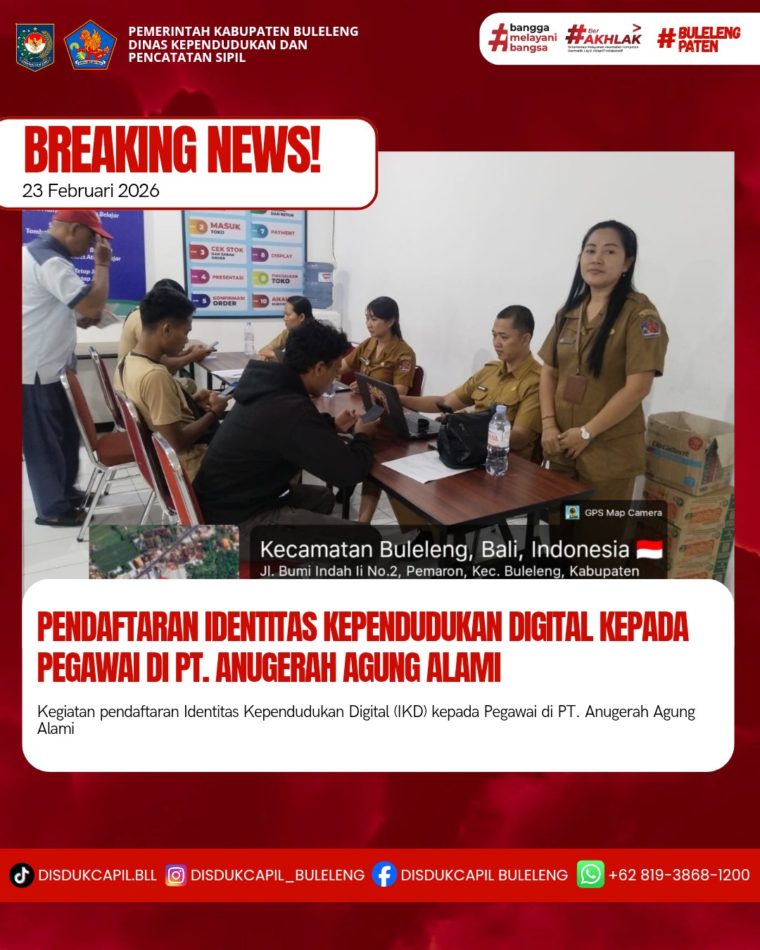 Menerapkan aturan pemerintah tersebut, Dinas Kependudukan dan Pencatatan Sipil Kabupaten Buleleng menyelenggarakan Pendaftaran Identitas Kependudukan Digital ke sekolah-sekolah, Dinas, Lembaga dan Perusahaan secara bergilir setiap harinya. Kali ini pelaksanaan pendaftaran Identitas Kependudukan Digital kepada Pegawai yang dilaksanakan di PT. Anugerah Agung Alami, Senin (23/2).