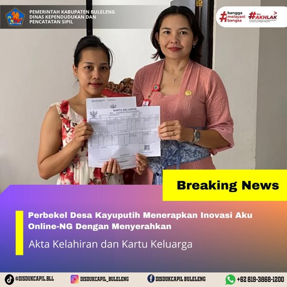 Pemerintah Kabupaten Buleleng melalui Dinas Kependudukan dan Pecatatan Sipil (Disdukcapil) Kabupaten Buleleng memaksimalkan serta mempermudah pelayanan kependudukan masyarakat dengan beberapa inovasi, melalui aplikasi AKU Online-NG. Dimana dalam penerapan aplikasi Aku Online-NG tersebut masyarakat tidak perlu lagi datang ke Dinas Dukcapil untuk melakukan pelayanan langsung cukup dengan datang ke Desa nanti akan dibantu oleh operator Desa masing-masing. Di Desa Kayuputih Kecamatan Banjar, telah diserahkan dokumen kependudukan berupa Akta Kelahiran dan Kartu Keluarga atas nama Luh Tarik Kusuma Yanti warga Banjar Dinas Menagung yang diserahkan oleh Perbekel Desa Kayuputih Kecamatan Banjar Kadek Dina Nuriani, Kamis (18/12).
