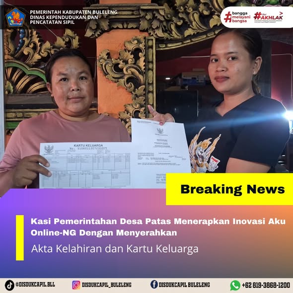 Pemerintah Kabupaten Buleleng melalui Dinas Kependudukan dan Pecatatan Sipil (Disdukcapil) Kabupaten Buleleng memaksimalkan serta mempermudah pelayanan kependudukan masyarakat dengan beberapa inovasi, melalui aplikasi AKU Online-NG. Dimana dalam penerapan aplikasi Aku Online-NG tersebut masyarakat tidak perlu lagi datang ke Dinas Dukcapil untuk melakukan pelayanan langsung cukup dengan datang ke Desa nanti akan dibantu oleh operator Desa masing-masing. Di Desa Patas Kecamatan Gerokgak, telah diserahkan dokumen kependudukan berupa Akta Kelahiran atas nama Kadek Kariana dan Kartu Keluarga warga Banjar Dinas Tegal Sari, Desa Patas yang diserahkan langsung oleh Kasi Pemerintahan Desa Patas Kecamatan Gerokgak, Jumat (5/12).