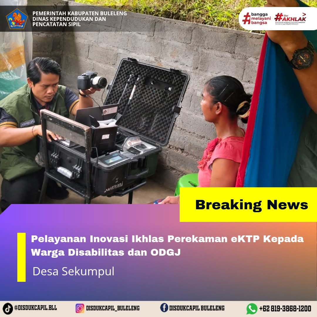 Dinas Kependudukan dan Pencatatan Sipil Kabupaten Buleleng terus berupaya memberikan pelayanan maksimal pada masyarakat dalam rangka meningkatkan kesadaran kepada masyarakat akan pentingnya memiliki dokumen kependudukan salah satunya Kartu Tanda Penduduk (KTP). Berbagai macam inovasi dikembangkan untuk mempermudah masyarakat dapat memiliki dokumen kependudukan. Salah satu Inovasi yang diberikan kepada masyarakat adalah Inovasi "IKHLAS" (Tim Khusus Layanan Untuk Orang Sakit dan Disabilitas) yaitu jembut bola perekaman KTP-el ke rumah warga yang tidak bisa datang langsung ke Kantor Disdukcapil untuk melakukan perekaman eKTP. Sesuai dengan Undang-Undang Republik Indonesia Nomor 24 Tahun 2013 tentang Administrasi Kependudukan, menyatakan bahwa Penduduk Warga Negara Indonesia dan Orang Asing yang memiliki Izin Tinggal Tetap yang telah berumur 17 (tujuh belas) tahun atau telah kawin atau pernah kawin wajib memiliki KTP-el. Namun demikian, ada beberapa penduduk yang tidak bisa datang langsung ke Kantor Dinas Kependudukan dan Pencatatan Sipil Kabupaten Buleleng karena kendala kesehatan dan usia lanjut.