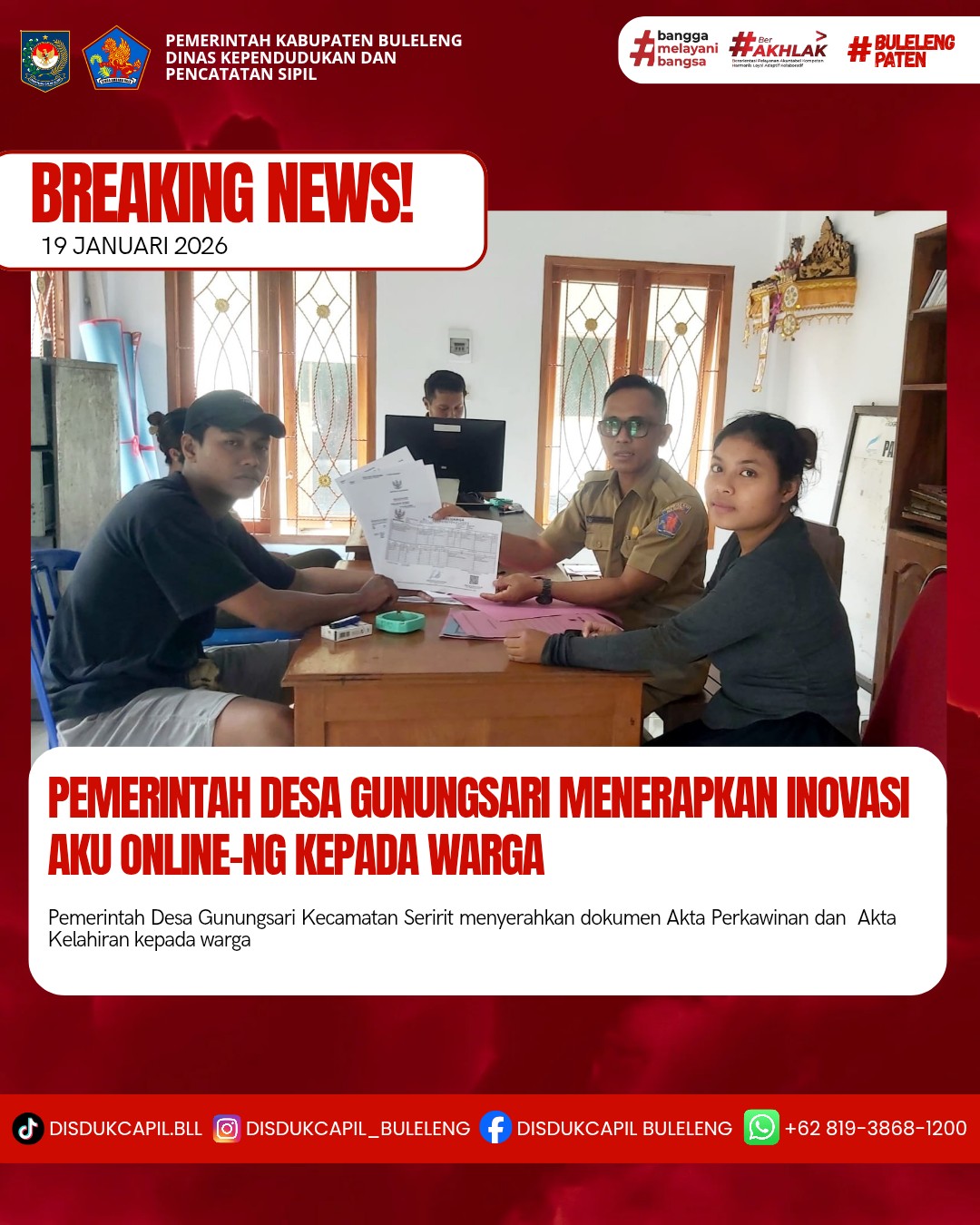 Pemerintah Kabupaten Buleleng melalui Dinas Kependudukan dan Pecatatan Sipil (Disdukcapil) Kabupaten Buleleng memaksimalkan serta mempermudah pelayanan kependudukan masyarakat dengan beberapa inovasi, melalui aplikasi AKU Online-NG. Dimana dalam penerapan aplikasi Aku Online-NG tersebut masyarakat tidak perlu lagi datang ke Dinas Dukcapil untuk melakukan pelayanan langsung cukup dengan datang ke Desa nanti akan dibantu oleh operator Desa masing-masing. Di Desa Gunungsari Kecamatan Seririt, telah diserahkan dokumen kependudukan berupa Akta Perkawinan atas nama GEDE RADITIYA SAPTA PRATAMA dan Akta Kelahiran atas nama PUTU MAYCHAL ARI PUTRA warga Banjar Dinas Sekar, Desa Gunungsari yang diserahkan oleh Pemerintah Desa Gunungsari kepada warga Banjar Dinas Sekar Desa Gunungsari, bertempat di Kantor Perbekel Desa Gunungsari, Kecamatan Seririt, Kabupaten Buleleng, Senin (19/1).
