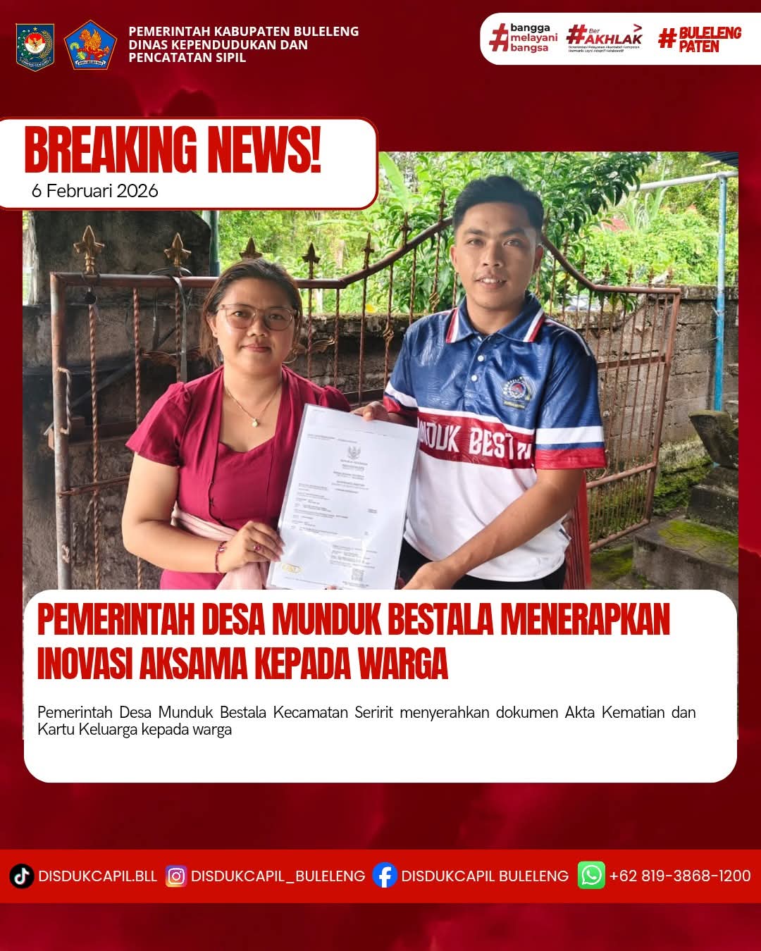Pemerintah Kabupaten Buleleng melalui Dinas Kependudukan dan Pecatatan Sipil (Disdukcapil) Kabupaten Buleleng memaksimalkan serta mempermudah pelayanan kependudukan masyarakat dengan beberapa inovasi, yakni BALITA (Bayi Lahir Berakta), NYAKSI (Menyerahkan Akta Kawin Saat Acara Perkawinan) dan AKSAMA ( Akta Kematian Diserahkan Saat Masih Berduka) melalui aplikasi Aku Online. Di Desa Munduk Bestala Kecamatan Seririt, telah diterapkan program Aksama (Akta Kematian Diserahkan Saat Masih Berduka) yang dilakukan secara langsung oleh Kelian Banjar Dinas Sari dengan menyerahkan Akta Kematian atas nama Ketut Srimin dan Kartu Keluarga kepada keluarga almarhum di Desa Munduk Bestala Kecamatan Seririt, Jumat (6/2).
