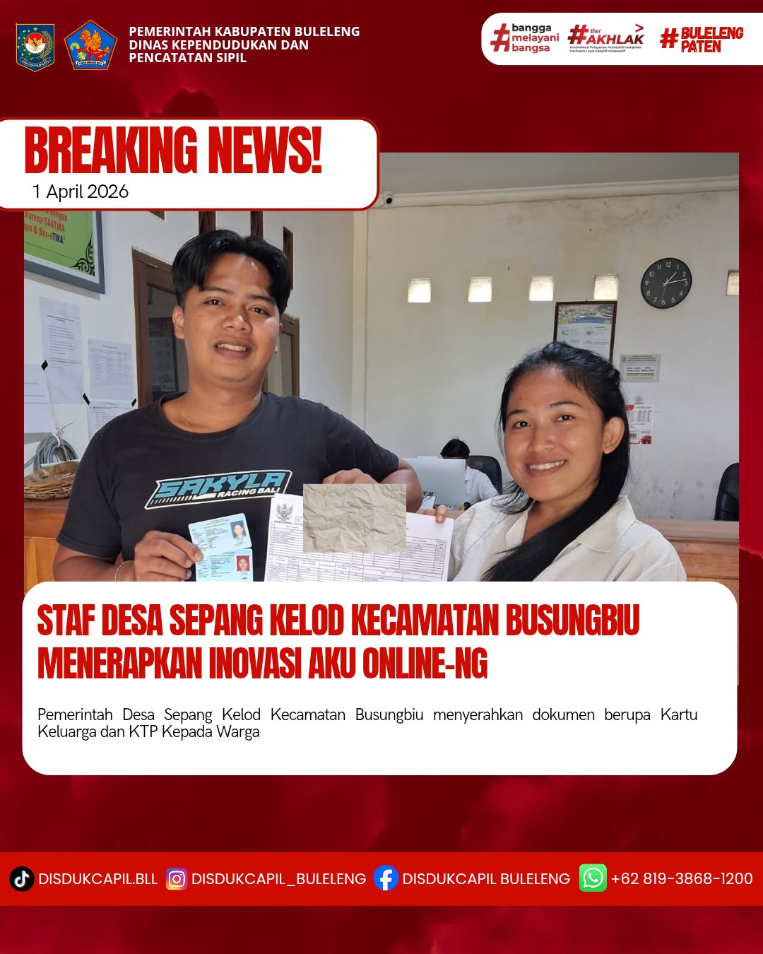 Pemerintah Kabupaten Buleleng melalui Dinas Kependudukan dan Pecatatan Sipil (Disdukcapil) Kabupaten Buleleng memaksimalkan serta mempermudah pelayanan kependudukan masyarakat dengan beberapa inovasi, melalui aplikasi AKU Online. Dimana dalam penerapan aplikasi Aku Online tersebut masyarakat tidak perlu lagi datang ke Dinas Dukcapil untuk melakukan pelayanan langsung, cukup dengan datang ke Desa nanti akan dibantu oleh operator Desa masing-masing. Di Desa Sepang Kelod Kecamatan Busungbiu telah diserahkan dokumen kependudukan berupa Kartu Keluarga dan KTP warga Banjar Dinas Asah Badung, Desa Sepang kelod Kecamatan Busungbiu yang diserahkan oleh Staf Kearsipan Desa Sepang Kelod, bertempat di Kantor Perbekel Desa Sepang Kelod, Kecamatan Busungbiu, Rabu (1/4).