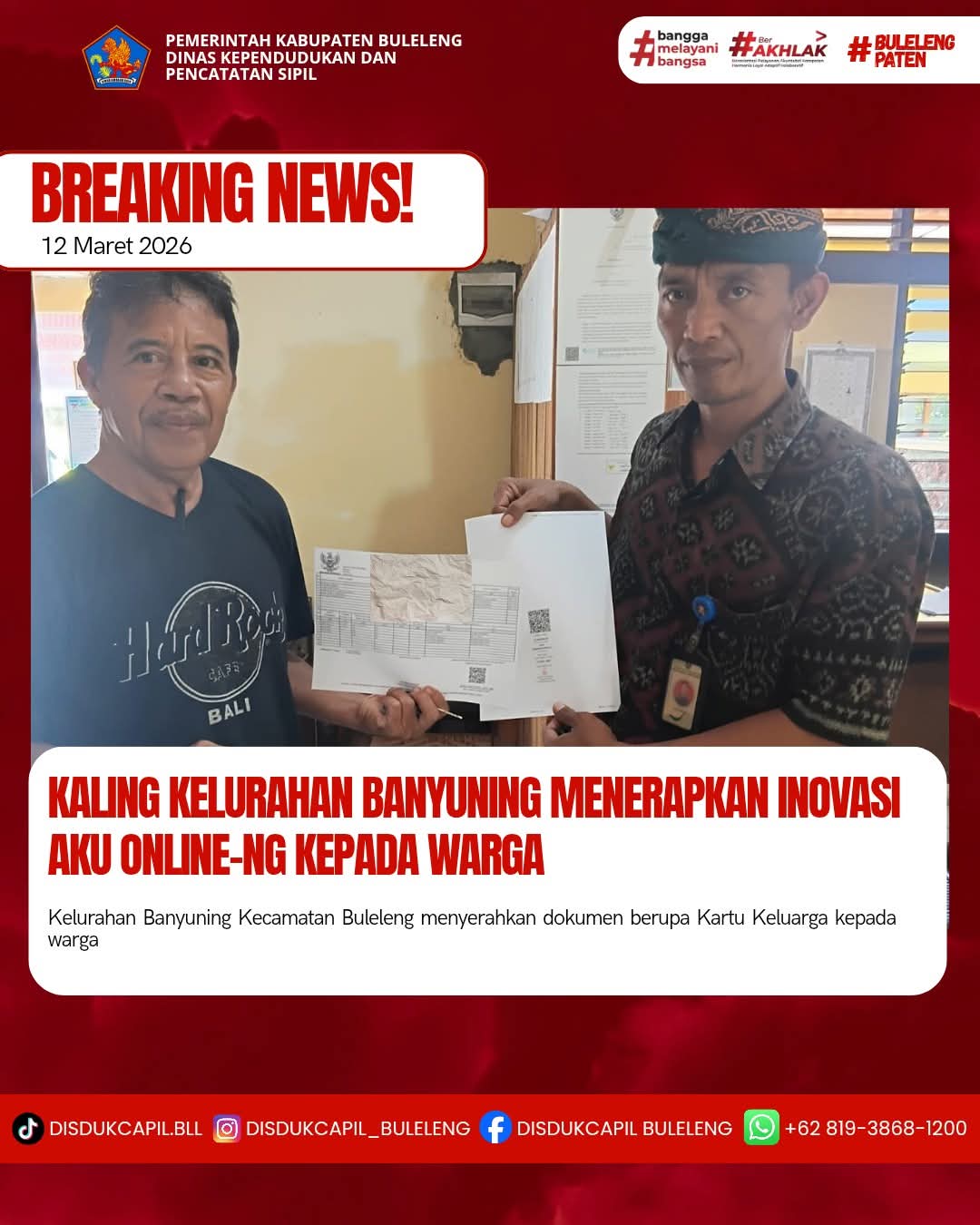 Pemerintah Kabupaten Buleleng melalui Dinas Kependudukan dan Pecatatan Sipil (Disdukcapil) Kabupaten Buleleng memaksimalkan serta mempermudah pelayanan kependudukan masyarakat dengan beberapa inovasi, melalui aplikasi AKU Online-NG. Dimana dalam penerapan aplikasi Aku Online-NG tersebut masyarakat tidak perlu lagi datang ke Dinas Dukcapil untuk melakukan pelayanan langsung cukup dengan datang ke Desa nanti akan dibantu oleh operator Desa masing-masing. Di Kelurahan Banyuasri Kecamatan Buleleng, telah diserahkan dokumen kependudukan berupa Kartu Keluarga yang diserahkan langsung oleh Kaling Kelurahan Banyuasri, Kecamatan Buleleng, Kabupaten Buleleng, Kamis (12/3).