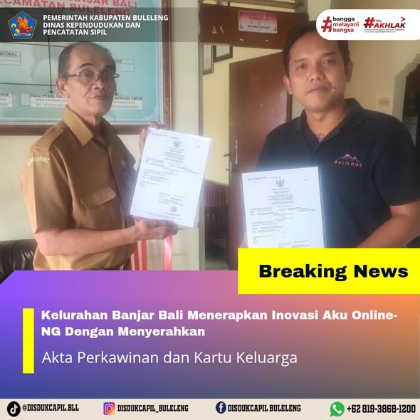 Pemerintah Kabupaten Buleleng melalui Dinas Kependudukan dan Pecatatan Sipil (Disdukcapil) Kabupaten Buleleng memaksimalkan serta mempermudah pelayanan kependudukan masyarakat dengan beberapa inovasi, melalui aplikasi AKU Online-NG. Dimana dalam penerapan aplikasi Aku Online-NG tersebut masyarakat tidak perlu lagi datang ke Dinas Dukcapil untuk melakukan pelayanan langsung cukup dengan datang ke Desa nanti akan dibantu oleh operator Desa masing-masing. Di Kelurahan Banjar Bali Kecamatan Buleleng, telah diserahkan dokumen kependudukan berupa Akta Perkawinan atas nama DEWA MADE BUDI DARMAWAN dan Kartu Keluarga yang diserahkan langsung oleh Kelurahan Banjar Jawa, Kecamatan Buleleng Kabupaten Buleleng, Senin (15/12).