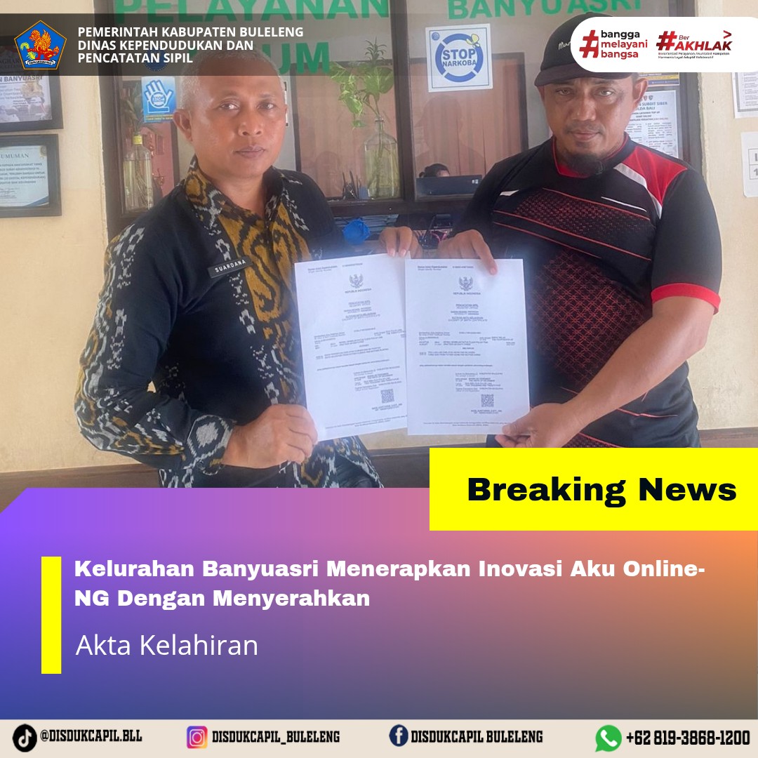 Pemerintah Kabupaten Buleleng melalui Dinas Kependudukan dan Pecatatan Sipil (Disdukcapil) Kabupaten Buleleng memaksimalkan serta mempermudah pelayanan kependudukan masyarakat dengan beberapa inovasi, melalui aplikasi AKU Online-NG. Dimana dalam penerapan aplikasi Aku Online-NG tersebut masyarakat tidak perlu lagi datang ke Dinas Dukcapil untuk melakukan pelayanan langsung cukup dengan datang ke Desa nanti akan dibantu oleh operator Desa masing-masing. Di Kelurahan Banyuasri Kecamatan Buleleng, telah diserahkan dokumen kependudukan berupa Akta Kelahiran atas nama ABU BAKAR dan istrinya KERTIASIH yang beralamat beralamat Jalak Putih 5 Kelurahan Banyuasri yang diserahkan langsung oleh Kaling Kelurahan Banyuasri Kecamatan Buleleng, Kabupaten Buleleng, Kamis (11/12).