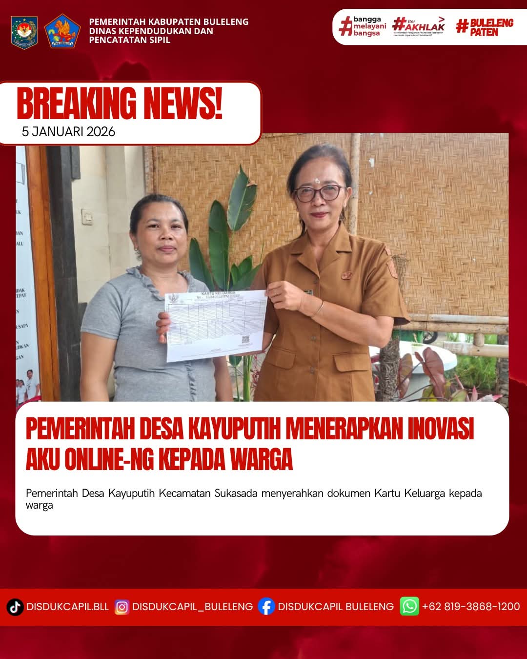 Pemerintah Kabupaten Buleleng melalui Dinas Kependudukan dan Pecatatan Sipil (Disdukcapil) Kabupaten Buleleng memaksimalkan serta mempermudah pelayanan kependudukan masyarakat dengan beberapa inovasi, melalui aplikasi AKU Online-NG. Dimana dalam penerapan aplikasi Aku Online-NG tersebut masyarakat tidak perlu lagi datang ke Dinas Dukcapil untuk melakukan pelayanan langsung cukup dengan datang ke Desa nanti akan dibantu oleh operator Desa masing-masing. Di Desa Kayuputih Kecamatan Sukasada, telah diserahkan dokumen kependudukan berupa Kartu Keluarga atas nama Wayan Suastini warga Banjar Dinas Melaka, Desa Kayu Putih yang diserahkan secara langsung oleh Kelian Banjar Dinas Melaka, Desa Kayuputih Kecamatan Sukasada, Senin (5/1).