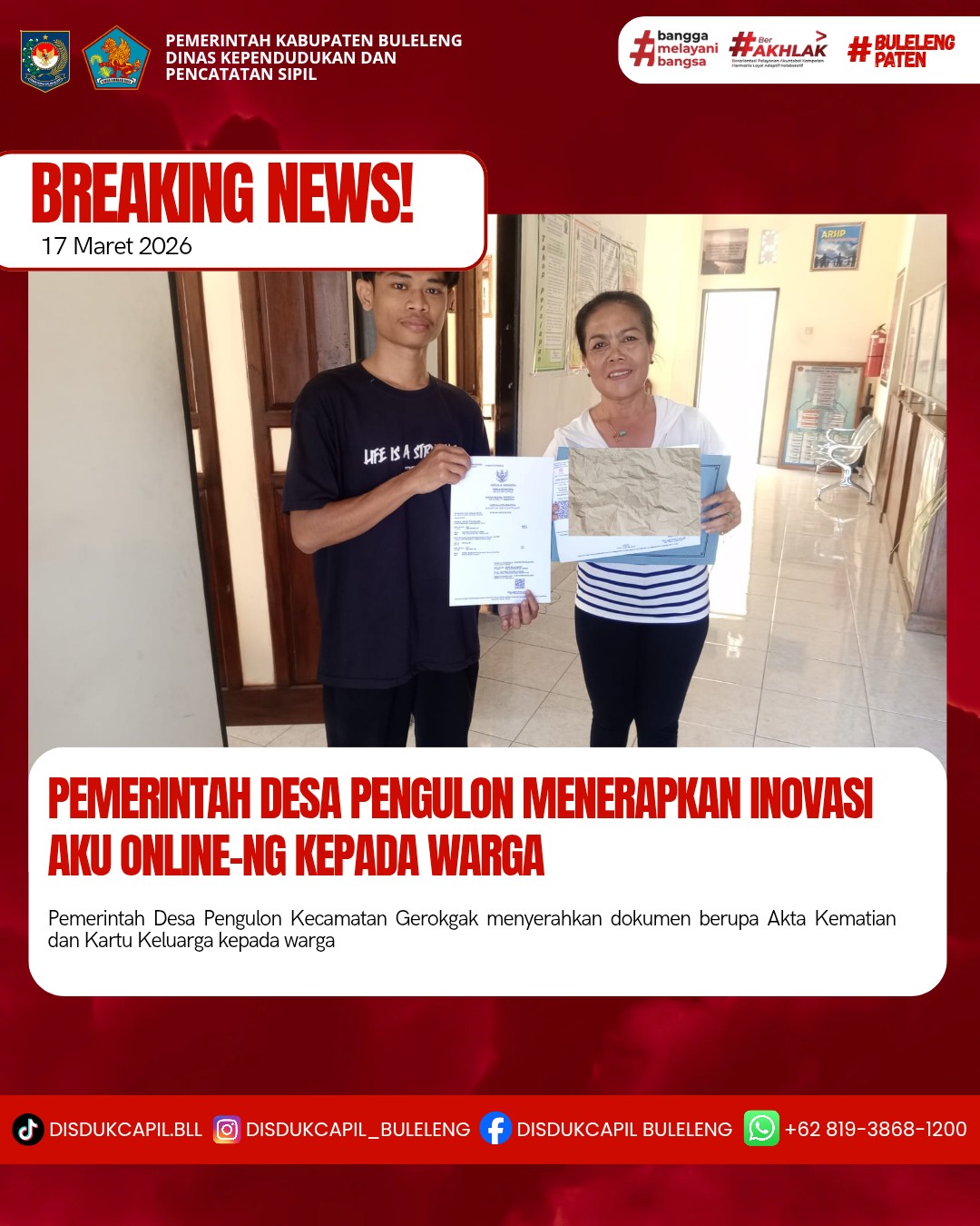 Pemerintah Kabupaten Buleleng melalui Dinas Kependudukan dan Pecatatan Sipil (Disdukcapil) Kabupaten Buleleng memaksimalkan serta mempermudah pelayanan kependudukan masyarakat dengan beberapa inovasi, melalui aplikasi AKU Online-NG. Dimana dalam penerapan aplikasi Aku Online-NG tersebut masyarakat tidak perlu lagi datang ke Dinas Dukcapil untuk melakukan pelayanan langsung cukup dengan datang ke Desa nanti akan dibantu oleh operator Desa masing-masing. Di Desa Pengulon Kecamatan Gerokgak, telah diserahkan dokumen kependudukan berupa Akta Kematian dan Kartu Keluarga yang diserahkan secara langsung oleh Kasi Pelayanan Ni Ketut Intrianingsih Desa Pengulon Kecamatan Gerokgak, Selasa (17/3).
