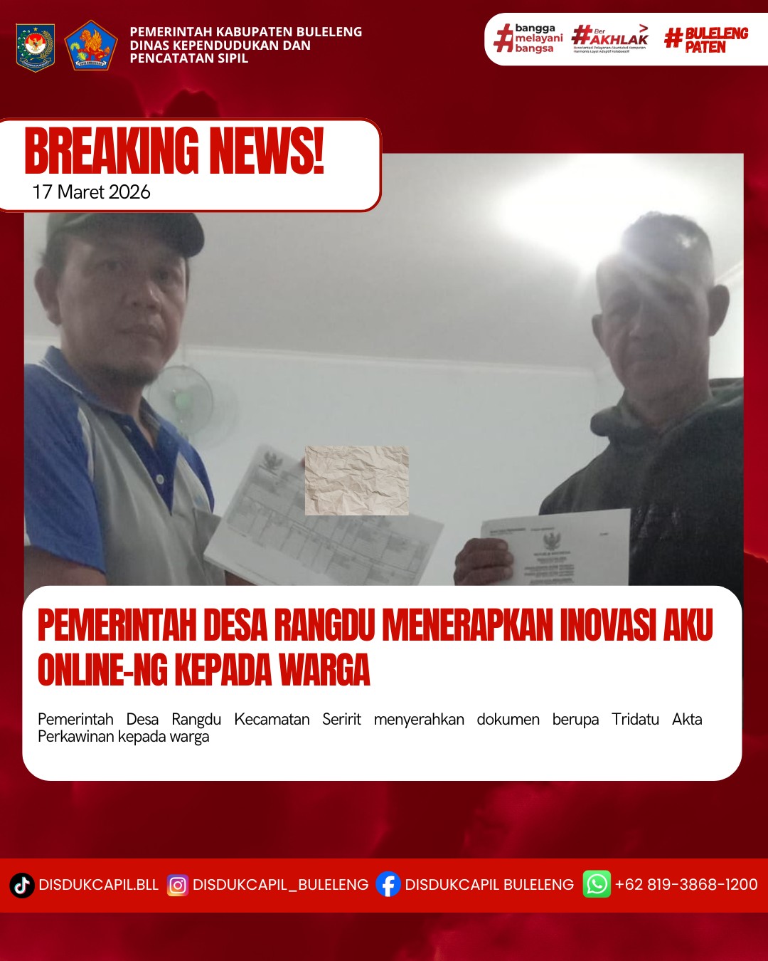 Pemerintah Kabupaten Buleleng melalui Dinas Kependudukan dan Pecatatan Sipil (Disdukcapil) Kabupaten Buleleng memaksimalkan serta mempermudah pelayanan kependudukan masyarakat dengan beberapa inovasi, melalui aplikasi AKU Online. Dimana dalam penerapan aplikasi Aku Online tersebut masyarakat tidak perlu lagi datang ke Dinas Dukcapil untuk melakukan pelayanan langsung cukup dengan datang ke Desa nanti akan dibantu oleh operator Desa masing-masing. Di Desa Rangdu Kecamatan Seririt telah diserahkan dokumen kependudukan berupa Akta Perkawinan dan Kartu Keluarga atas nama I Kadek Widiana dan Luh Putu Yanik Setia Wardani serta Kartu Keluarga atas nama Gede Bagiadnya diserahkan langsung oleh Kadus Kerta Nadi, Desa Rangdu, Kecamatan Seririt, Selasa (17/3).