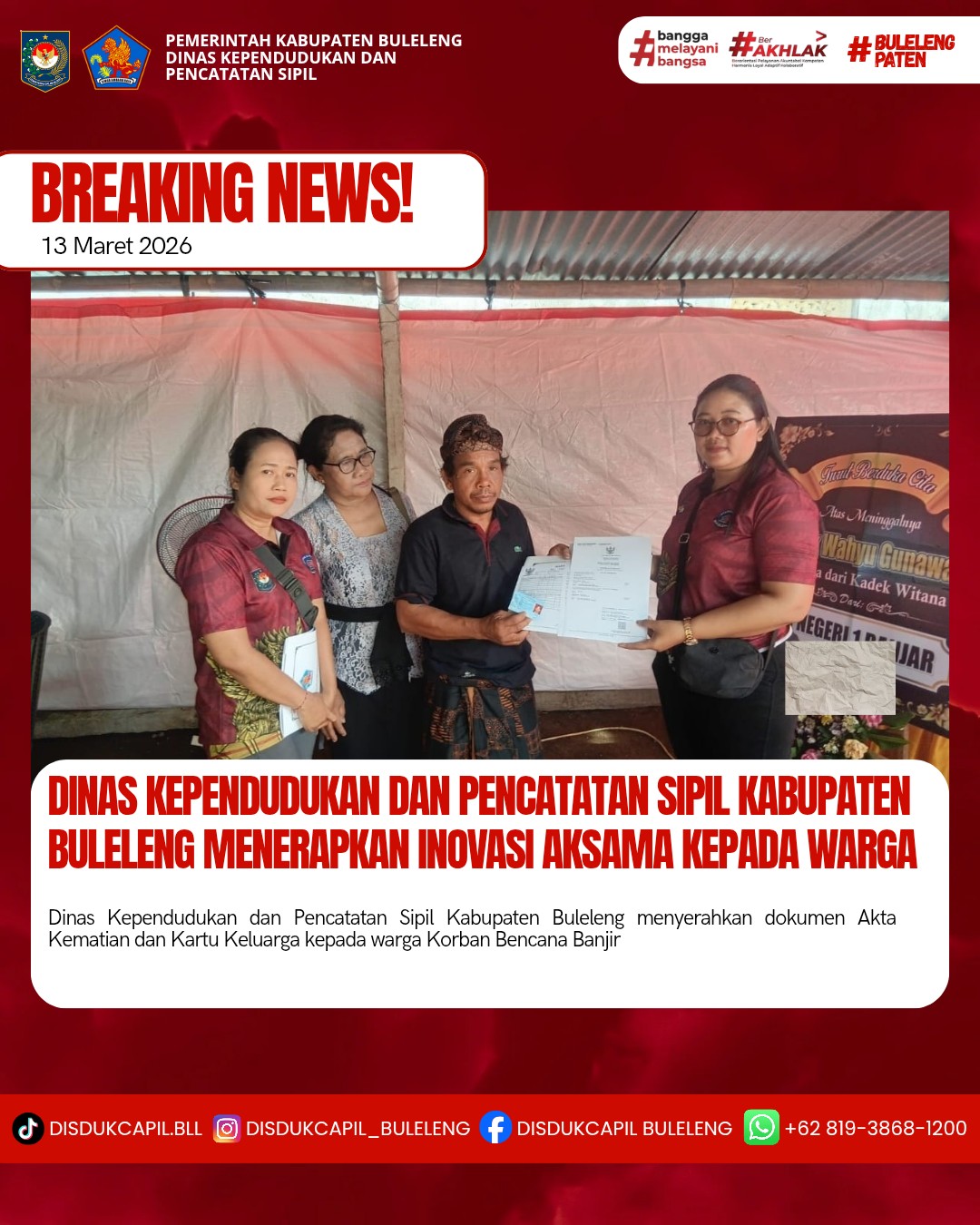 Pemerintah Kabupaten Buleleng melalui Dinas Kependudukan dan Pecatatan Sipil (Disdukcapil) Kabupaten Buleleng memaksimalkan serta mempermudah pelayanan kependudukan masyarakat dengan beberapa inovasi, yakni BALITA (Bayi Lahir Berakta), NYAKSI (Menyerahkan Akta Kawin Saat Acara Perkawinan) dan AKSAMA ( Akta Kematian Diserahkan Saat Masih Berduka) melalui aplikasi Aku Online. Dinas Kependudukan dan Pencatatan Sipil Kabupaten Buleleng telah diterapkan program Aksama (Akta Kematian Diserahkan Saat Masih Berduka) yang dilakukan secara langsung oleh Staf Dinas Kependudukan dan Pencatatan Sipil Kabupaten Buleleng dengan menyerahkan Akta Kematian dan Kartu Keluarga kepada pihak keluarga di rumah duka, Jumat (13/3).