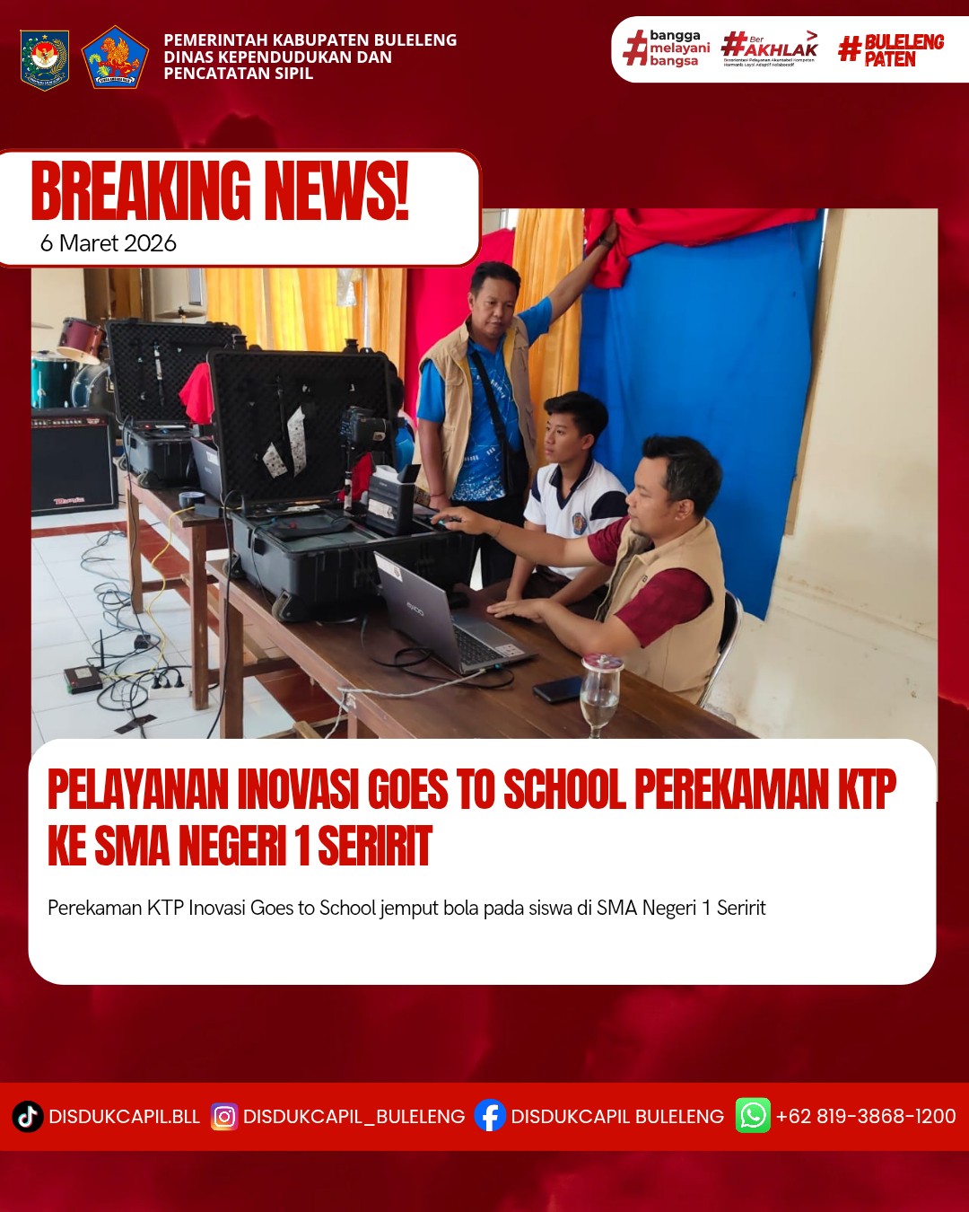 Pada kali ini Jumat, 6 Maret 2026 pelayanan perekaman KTP-el dilaksanakan di SMA Negeri 1 Seririt. Hasil perekaman di SMA Negeri 1 Seririt dengan data BNBA sebanyak 127 orang dan total yang melakukan perekaman sebanyak 51 orang, dimana hasil perekaman data di dalam BNBA sebanyak 49 orang dan data diluar BNBA sebanyak 2 orang yang melakukan perekaman. Dilihat dari hasil tersebut sisa data BNBA yang belum perekaman sebanyak 54 orang keterangan dari pihak sekolah untuk sisa BNBA sudah diinformasikan oleh sekolah tapi siswa tidak datang perekaman .dari pihak sekolah akan mengarahkan perekaman secara mandiri ke Kantor Camat.