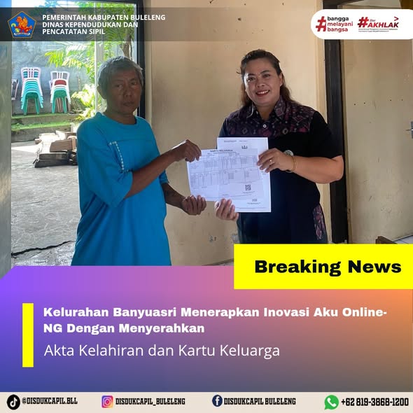 Pemerintah Kabupaten Buleleng melalui Dinas Kependudukan dan Pecatatan Sipil (Disdukcapil) Kabupaten Buleleng memaksimalkan serta mempermudah pelayanan kependudukan masyarakat dengan beberapa inovasi, melalui aplikasi AKU Online-NG. Dimana dalam penerapan aplikasi Aku Online-NG tersebut masyarakat tidak perlu lagi datang ke Dinas Dukcapil untuk melakukan pelayanan langsung cukup dengan datang ke Desa nanti akan dibantu oleh operator Desa masing-masing. Di Kelurahan Banyuasri Kecamatan Buleleng, telah diserahkan dokumen kependudukan berupa Akta Kelahiran dan Kartu Keluarga atas nama Gede Sumerta yang beralamat beralamat Jalan Lingga Gang 3 Kel. Banyuasri yang diserahkan langsung oleh Kasi Pemerintahan Kelurahan Banyuasri Kecamatan Buleleng, Kabupaten Buleleng, Selasa (9/12).