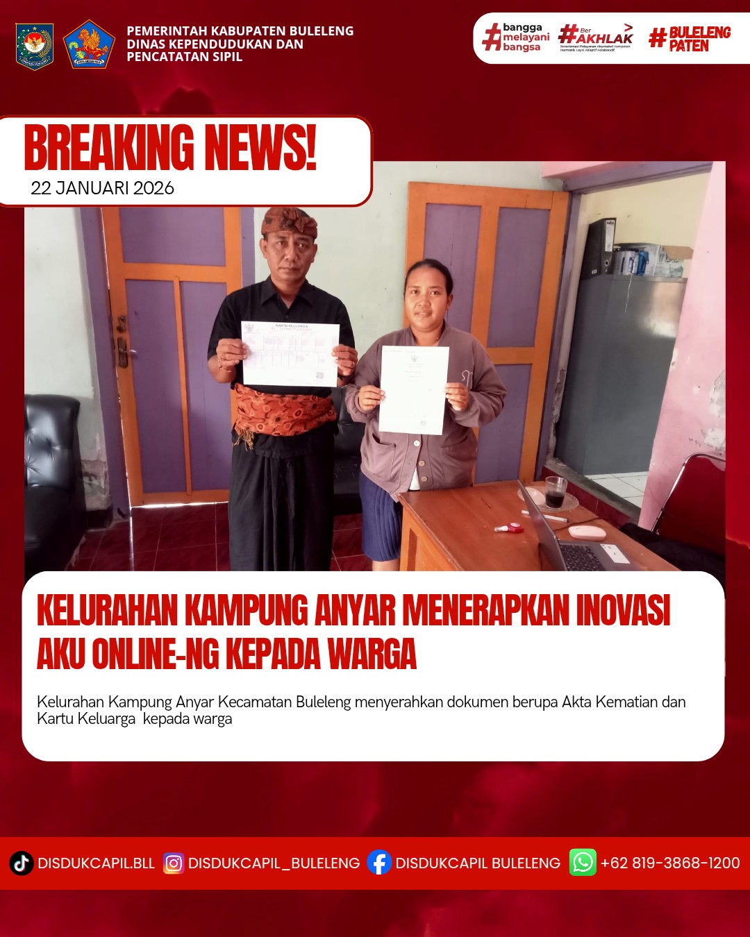 Pemerintah Kabupaten Buleleng melalui Dinas Kependudukan dan Pecatatan Sipil (Disdukcapil) Kabupaten Buleleng memaksimalkan serta mempermudah pelayanan kependudukan masyarakat dengan beberapa inovasi, melalui aplikasi AKU Online-NG. Dimana dalam penerapan aplikasi Aku Online-NG tersebut masyarakat tidak perlu lagi datang ke Dinas Dukcapil untuk melakukan pelayanan langsung cukup dengan datang ke Desa nanti akan dibantu oleh operator Desa masing-masing. Di Kelurahan Kampung Anyar Kecamatan Buleleng, telah diserahkan dokumen kependudukan berupa akta Kematian atas nama Gede Dangin dan Kartu Keluarga yang diserahkan langsung oleh Kelurahan Kampung Anyar Kecamatan Buleleng, Kabupaten Buleleng, Kamis (22/1).
