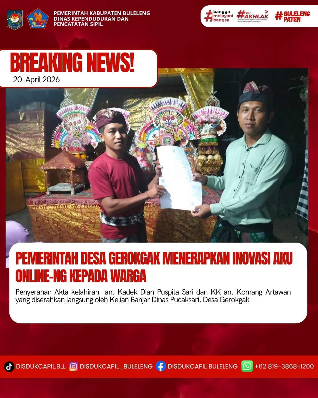 Pemerintah Kabupaten Buleleng melalui Dinas Kependudukan dan Pecatatan Sipil (Disdukcapil) Kabupaten Buleleng memaksimalkan serta mempermudah pelayanan kependudukan masyarakat dengan beberapa inovasi, melalui aplikasi AKU Online-NG. Dimana dalam penerapan aplikasi Aku Online-NG tersebut masyarakat tidak perlu lagi datang ke Dinas Dukcapil untuk melakukan pelayanan langsung, cukup dengan datang ke Desa nanti akan dibantu oleh operator Desa masing-masing. Di Desa Gerokgak Kecamatan Gerokgak, telah diserahkan dokumen kependudukan berupa Akta Kelahiran atas nama Kadek Dian Puspita Sari dan Kartu Keluarga atas nama Komang Artawan yang diserahkan langsung oleh Kelian Banjar Dinas Pucaksari di Desa Gerokgak, Kecamatan Gerokgak, Kabupaten Buleleng, Senin (20/4).