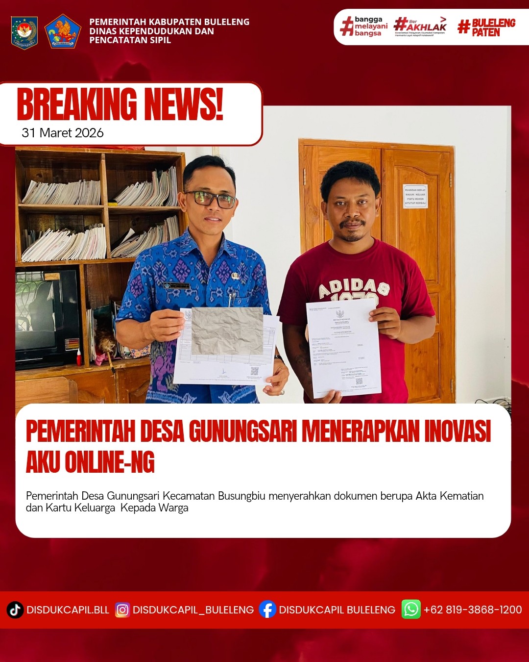 Pemerintah Kabupaten Buleleng melalui Dinas Kependudukan dan Pecatatan Sipil (Disdukcapil) Kabupaten Buleleng memaksimalkan serta mempermudah pelayanan kependudukan masyarakat dengan beberapa inovasi, melalui aplikasi AKU Online-NG. Dimana dalam penerapan aplikasi Aku Online-NG tersebut masyarakat tidak perlu lagi datang ke Dinas Dukcapil untuk melakukan pelayanan langsung, cukup dengan datang ke Desa nanti akan dibantu oleh operator Desa masing-masing. Di Desa Gunungsari Kecamatan Seririt, telah diserahkan dokumen kependudukan berupa Akta Kematian dan Kartu Keluarga atas nama Kadek Arsana warga Banjar Dinas Sekar, Desa Gunungsari yang diserahkan oleh Pemerintah Desa Gunungsari bertempat di Kantor Perbekel Desa Gunungsari, Kecamatan Seririt, Kabupaten Buleleng, Selasa (31/3).