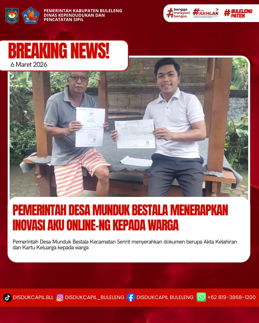 Pemerintah Kabupaten Buleleng melalui Dinas Kependudukan dan Pecatatan Sipil (Disdukcapil) Kabupaten Buleleng memaksimalkan serta mempermudah pelayanan kependudukan masyarakat dengan beberapa inovasi, melalui aplikasi AKU Online. Dimana dalam penerapan aplikasi Aku Online tersebut masyarakat tidak perlu lagi datang ke Dinas Dukcapil untuk melakukan pelayanan langsung cukup dengan datang ke Desa nanti akan dibantu oleh operator Desa masing-masing. Di Desa Munduk Bestala Kecamatan Seririt telah diserahkan dokumen kependudukan berupa Akta Kelahiran dan Kartu Keluarga atas nama I Ketut Dasi oleh Kelian Banjar Dinas Sari mewakili Perbekel Munduk Bestala Kecamatan Seririt, Kamis (6/3).